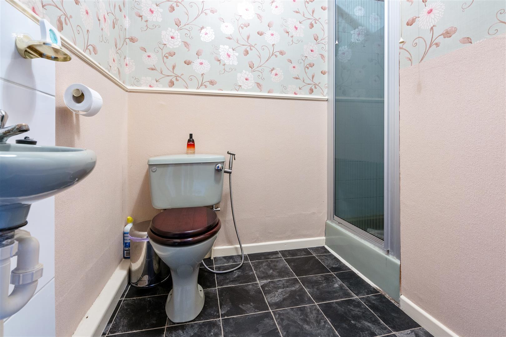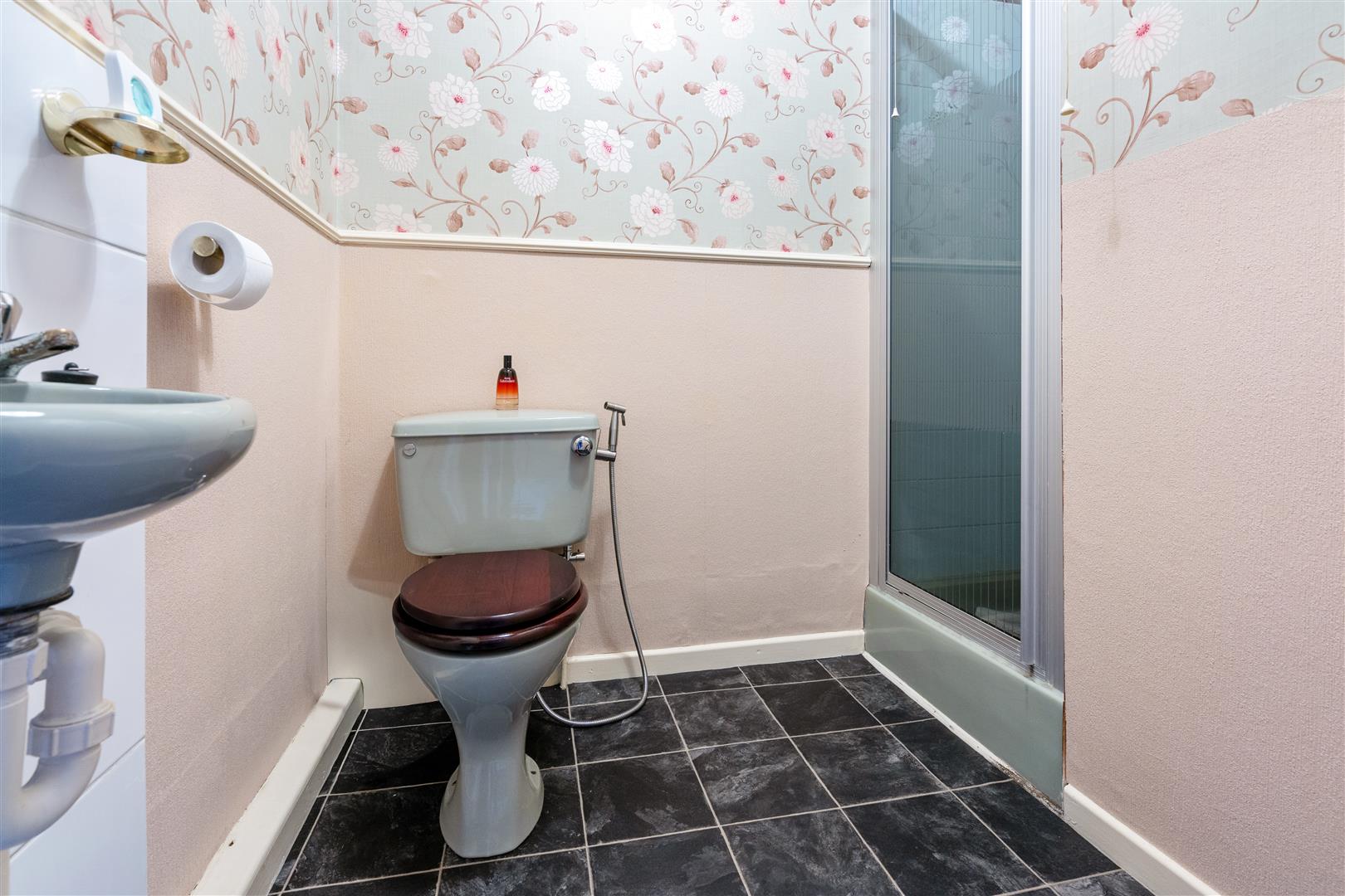 En suite shower room with close coupled WC, shower enclosure, wall mounted wash basin and complimentary tiling, dado rail, floral decor.
