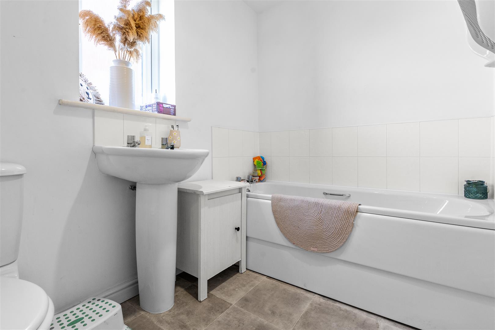 Immaculate family bathroom comprising close coupled push button WC, pedestal wash basin and panel bath, complimentary tiling and modern tiled flooring, fitted blind.