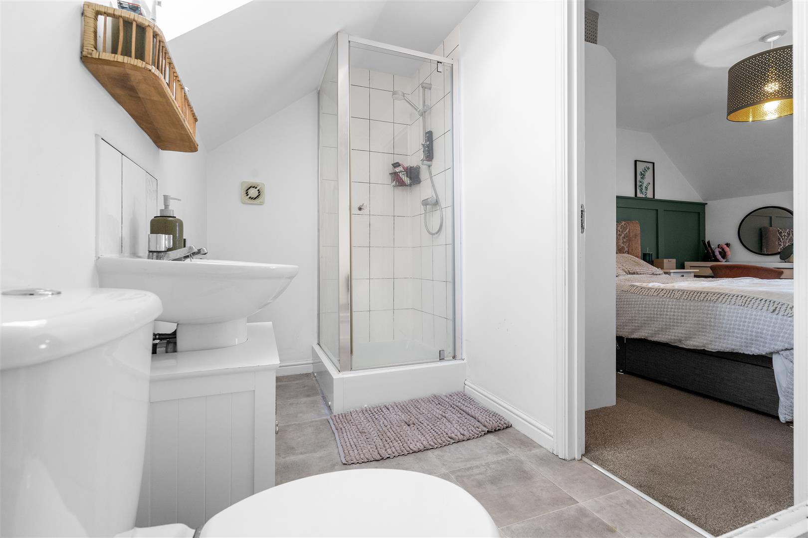 En suite shower room comprising close coupled WC, pedestal wash basin and shower enclosure, velux window, contemporary flooring.