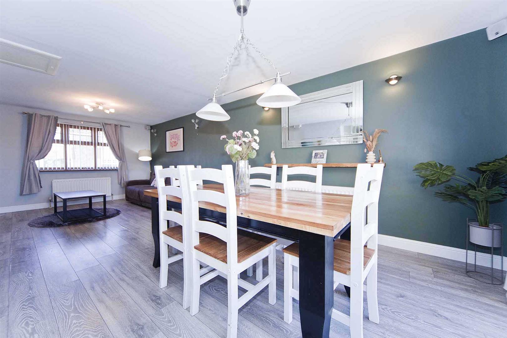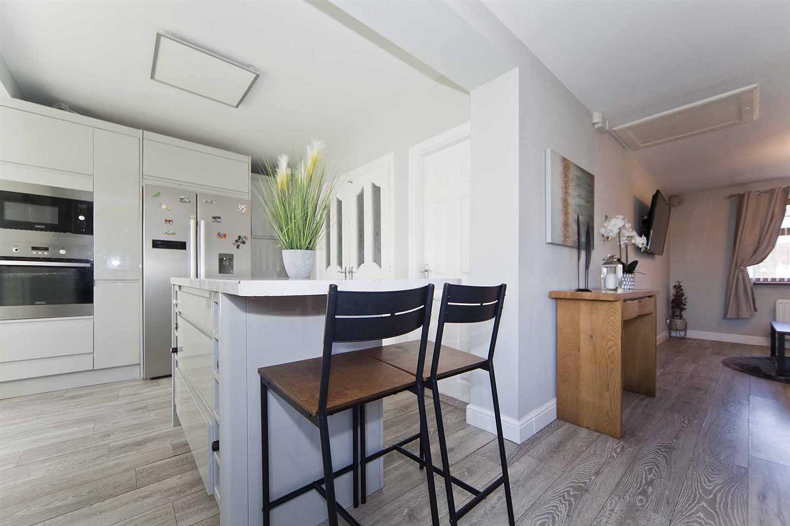 Fabulous extended snug/family room/dining room/kitchen with two sets of French doors opening to the rear garden, laminate flooring, contemporary decor, superb central breakfasting island, fitted with an array of sleek wall, larder, base and drawer cabinetry, two wine racks, complimentary solid surfaces, subway tiled backsplash, space for fridge freezer, integrated microwave, integrated oven, integrated ceramic hob, integrated extractor hood, integrated dishwasher, ceramic sink with chrome mixer tap, ample space to relax and dine.