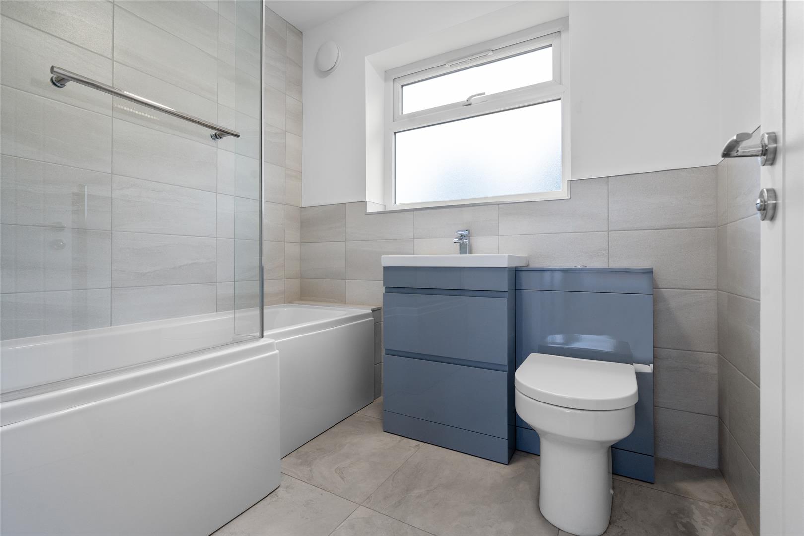 The delightful brand new and modern family bathroom features a fitted bath with shower head tap, shower enclosure, WC and wash basin,