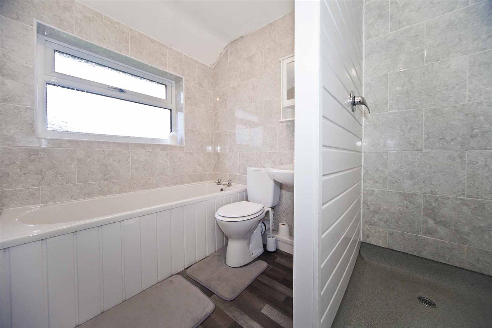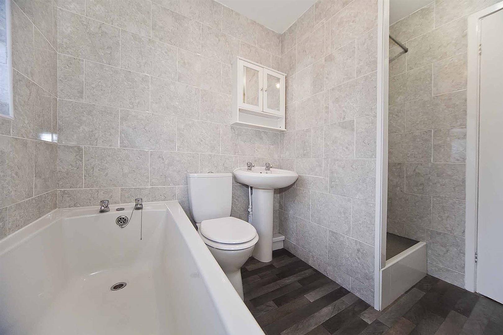 The large family bathroom comprises bath, shower enclosure, close coupled WC and pedestal wash basin, complimentary tiling.