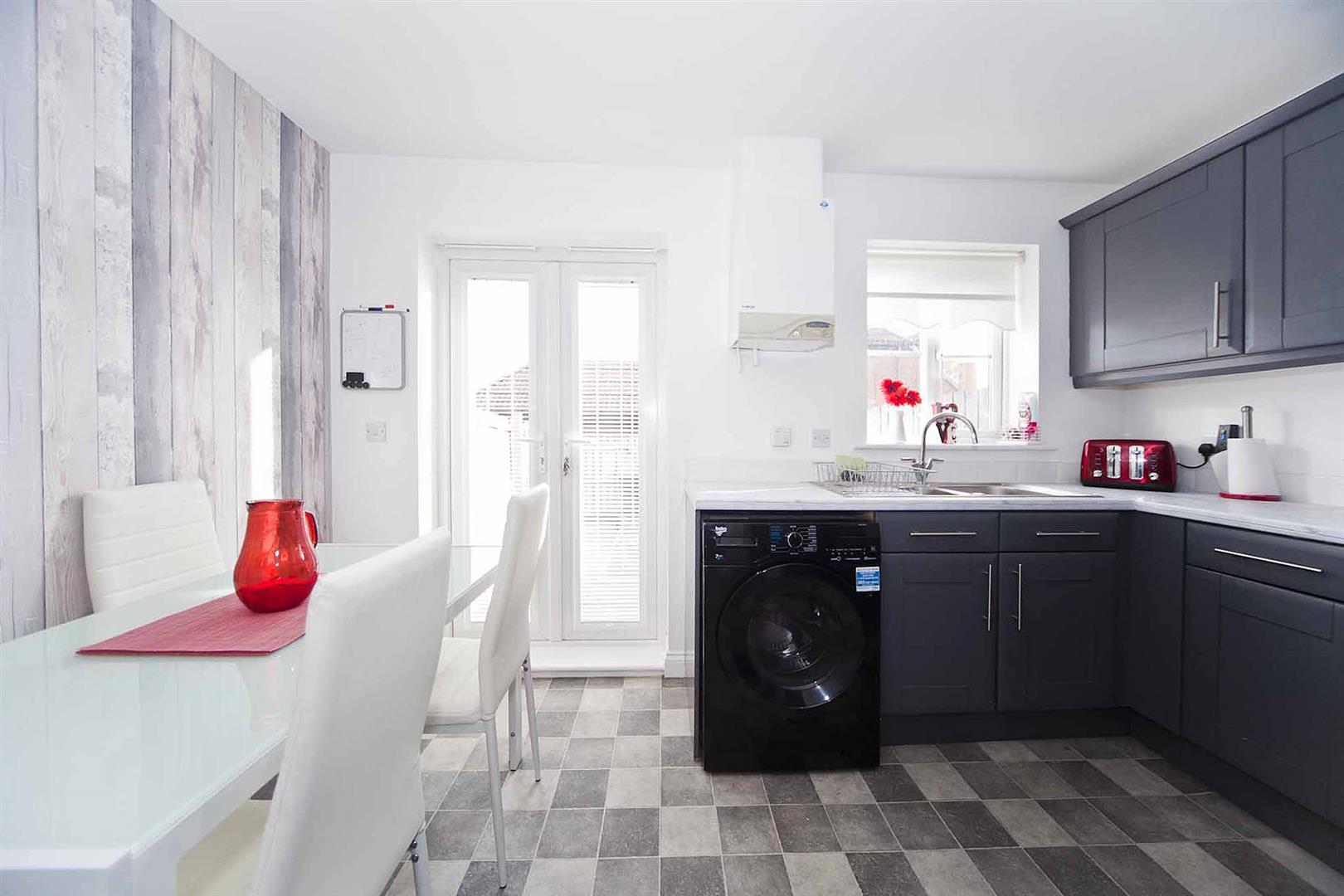Open concept kitchen diner fitted with a selection of wall base and drawer cabinetry, stylish work surfaces, stainless sink with chrome mixer tap, integrated oven, integrated gas hob, integrated stainless multifunction extractor hood, plumbing for washing machine, space for fridge freezer, ample space to dine, French doors opening to the garden.