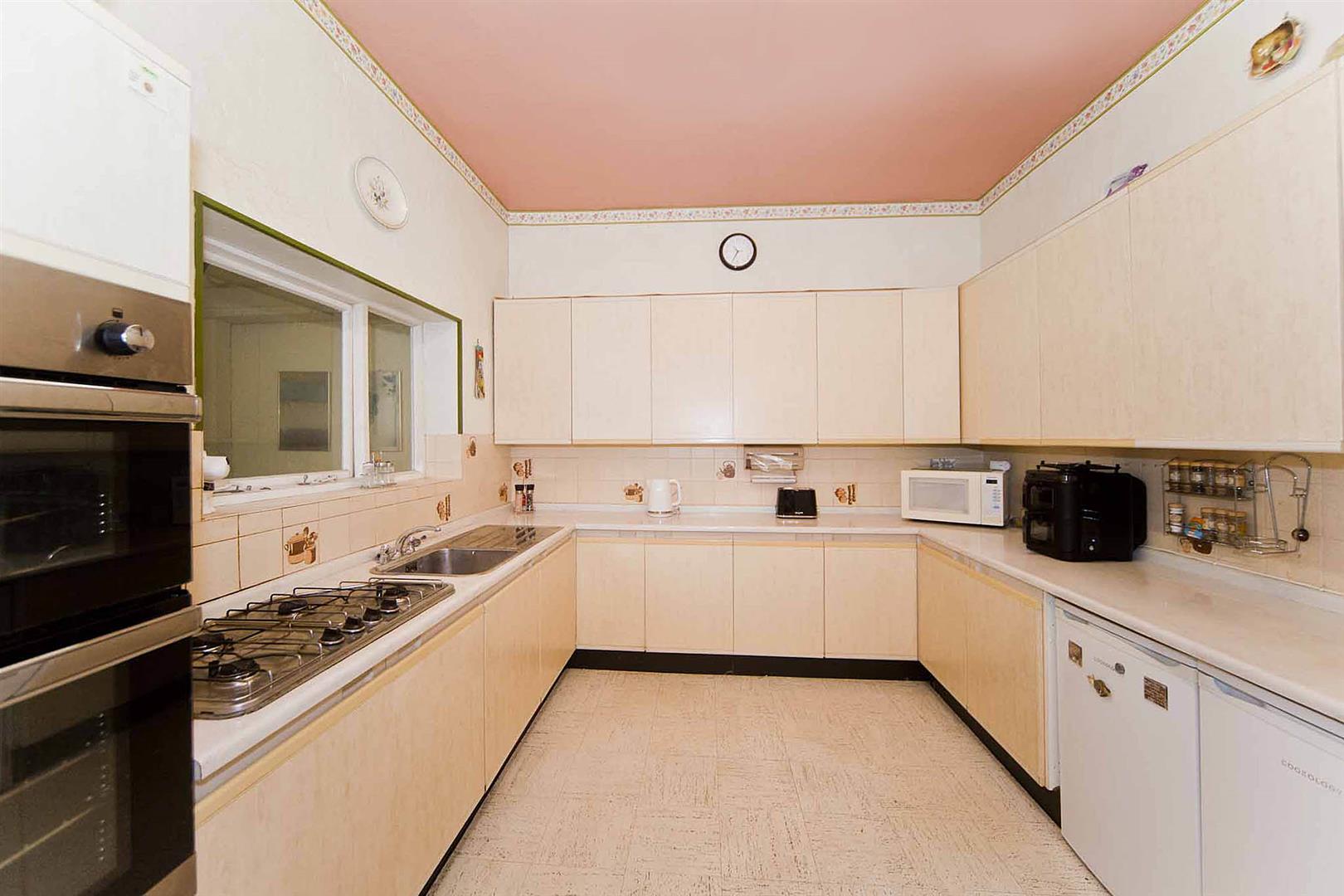 Fitted kitchen comprising wall and base units, tiled backsplash, integrated double oven integrated gas hob, stainless sink, space for fridge and freezer, plumbing for washing machine.