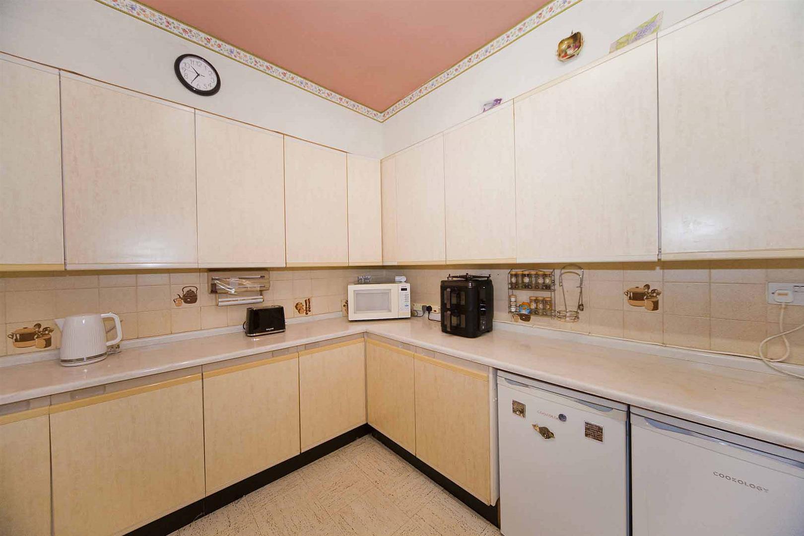 Additional kitchen with fitted storage cupboard and comprising wall, base and drawer cabinets with sink and space for appliances.