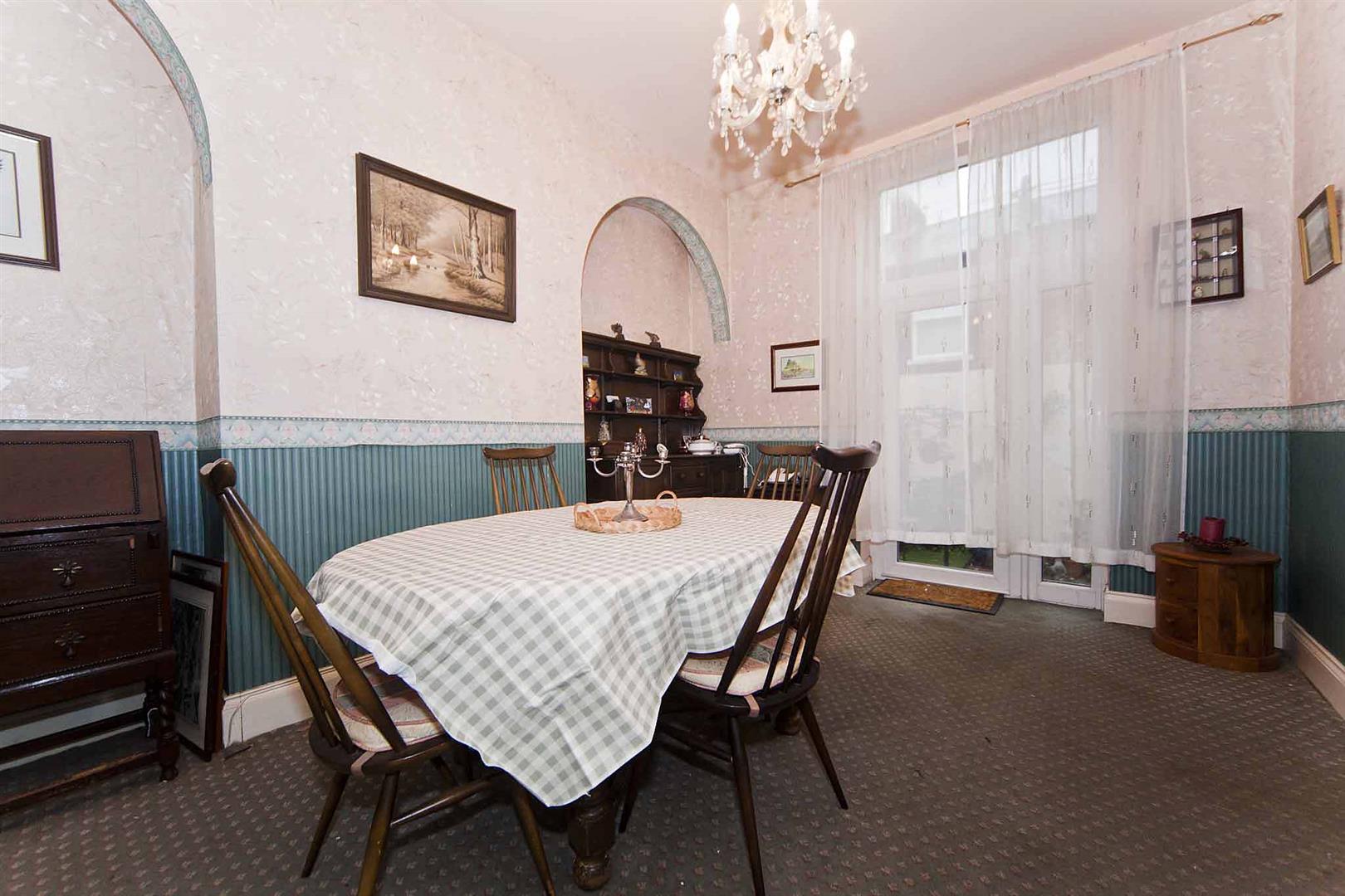 Excellent dining room with French doors opening to the rear, traditional decor, semi open plan to;