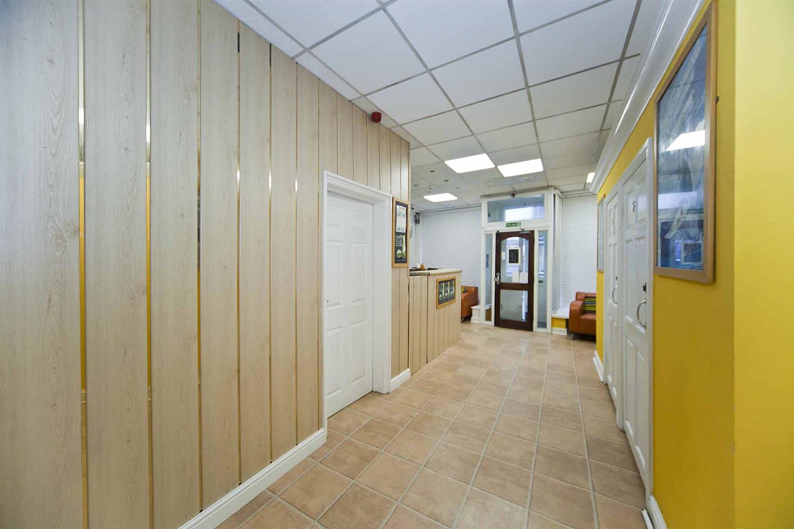 Large reception area, tiled floor, suspended ceiling, recessed spotlights, wood panelling, built in reception desk.