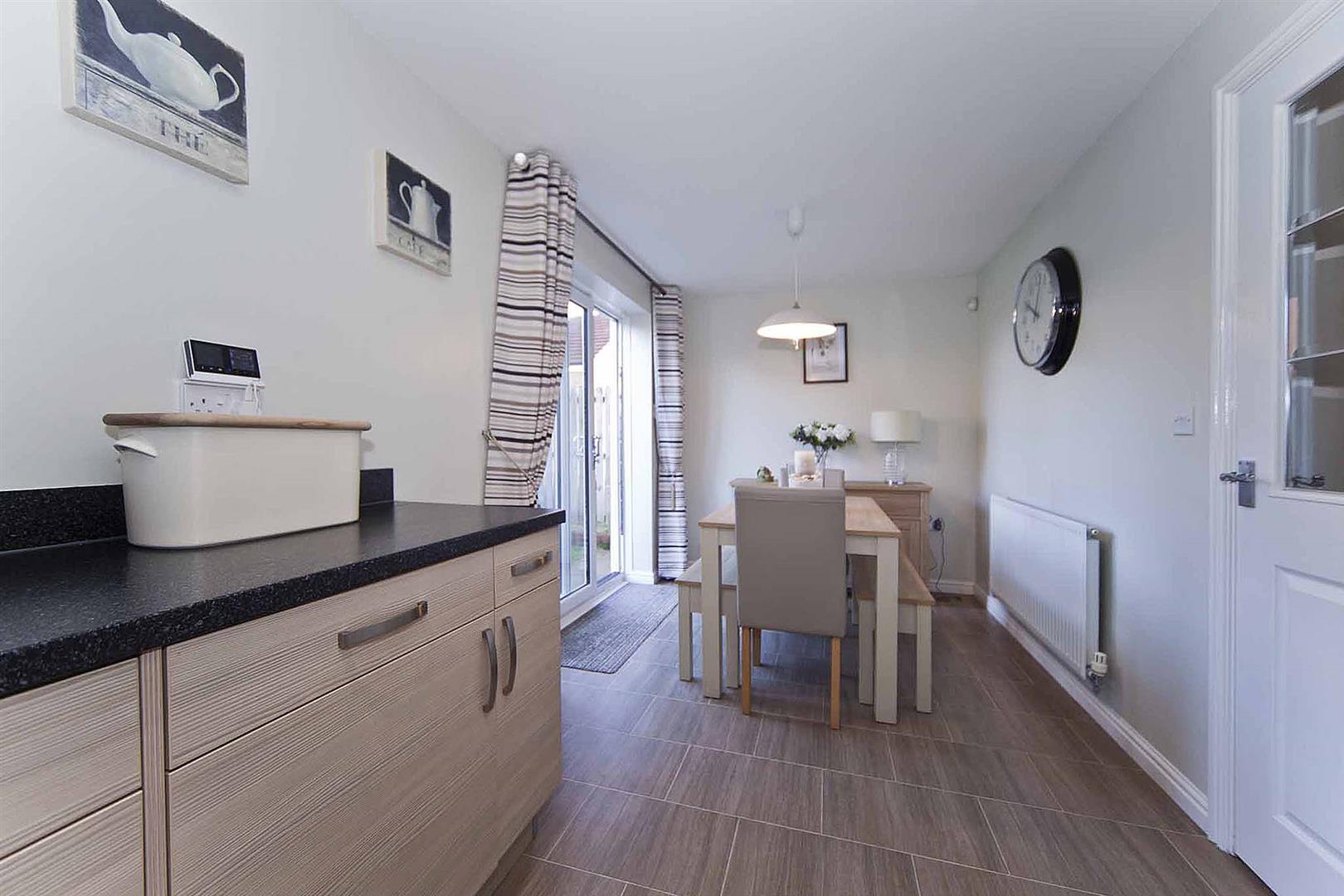 Open concept kitchen diner which comprises modern wall, base, larder and drawer cabinetry with complementary surfaces, integrated oven, integrated gas hob, integrated extractor, stainless sink with chrome mixer tap, integrated washing machine, integrated fridge freezer, integrated dishwasher, tiled floor, recessed spotlights, space to dine and with patio doors which open to the rear garden.