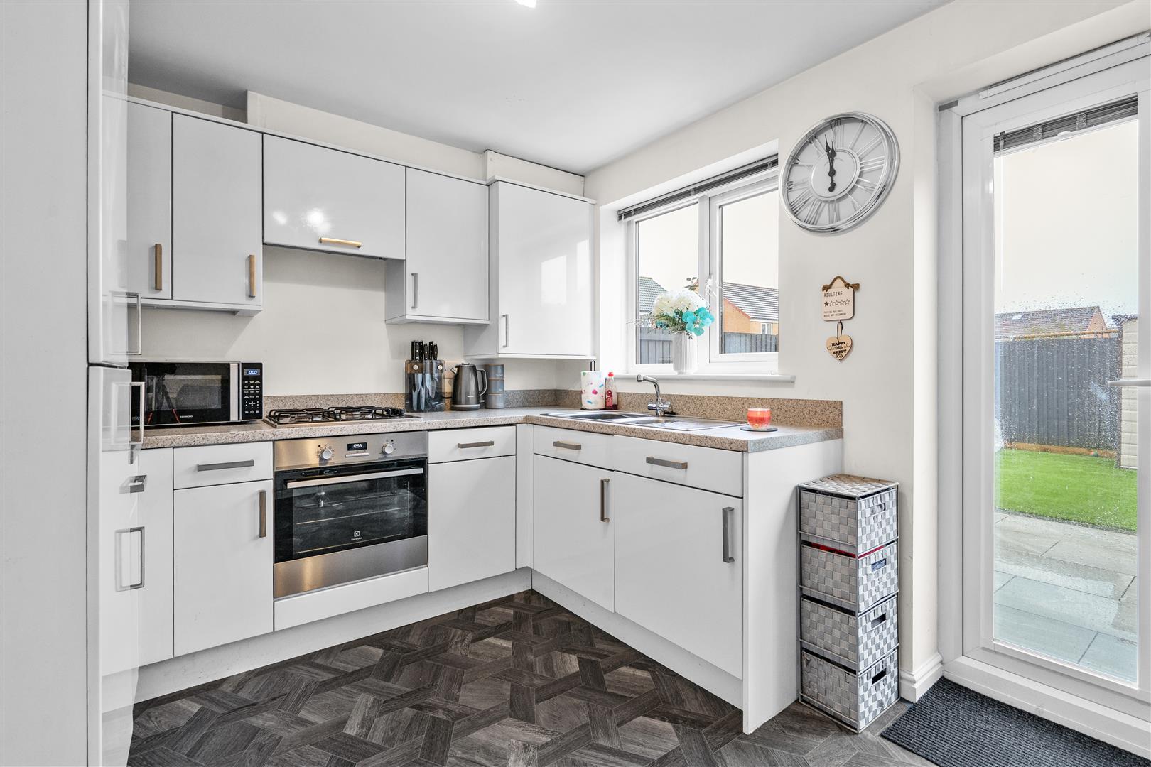 Excellent high gloss white dining kitchen comprising contemporary wall, drawer and base cabinets, complimentary heat resistant work surfaces, stainless one and a half bowl sink with chrome mixer taps integrated gas hob, integrated electric oven, integrated washing machine, integrated dishwasher, integrated fridge freezer , breakfast bar, alternatively with space for a dining table, double doors opening to the rear garden, modern flooring, immaculately presented.