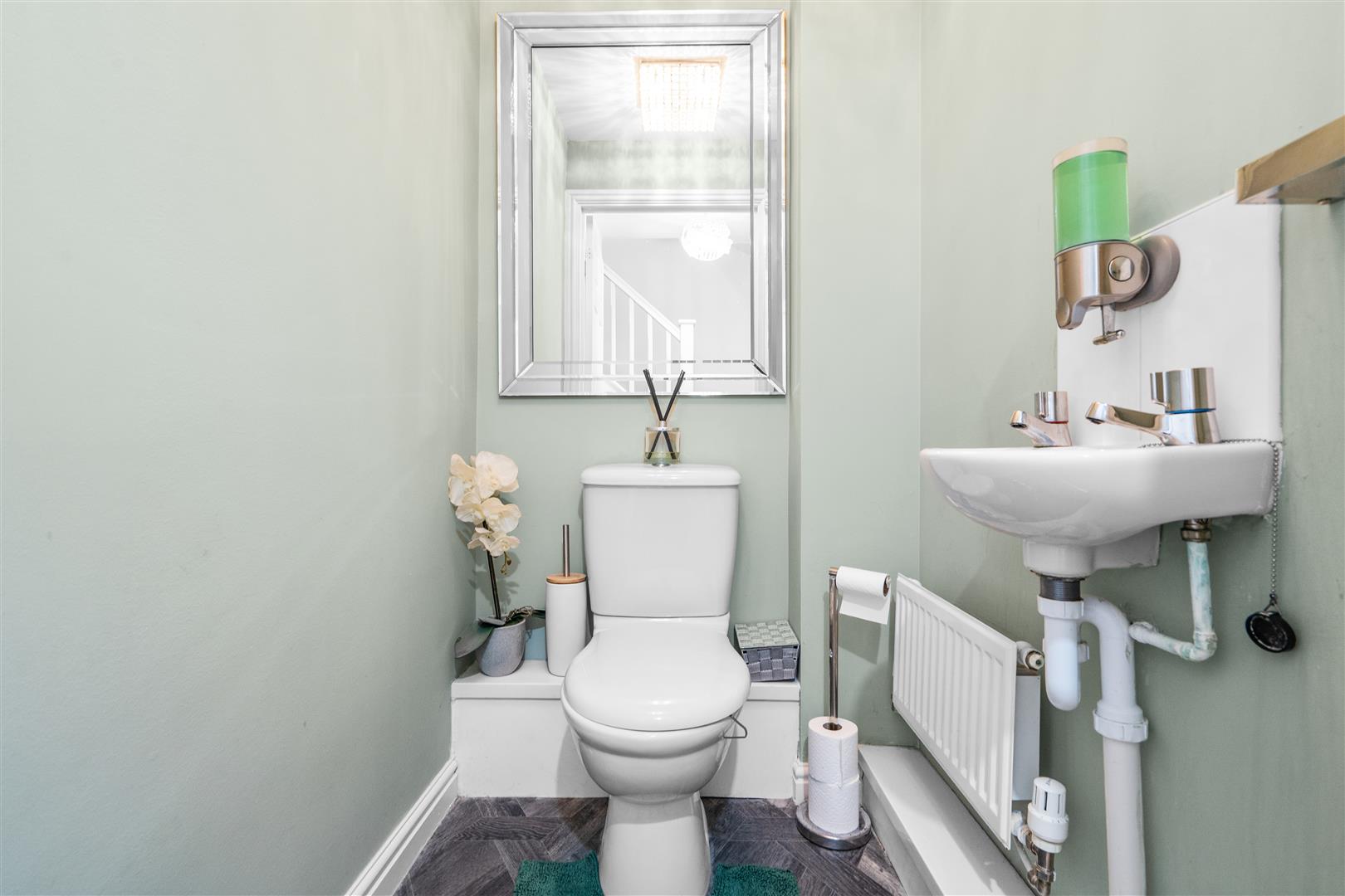 The modern family bathroom comprises bath, close coupled toilet and pedestal wash basin with chrome fixtures, modern flooring, immaculately presented.