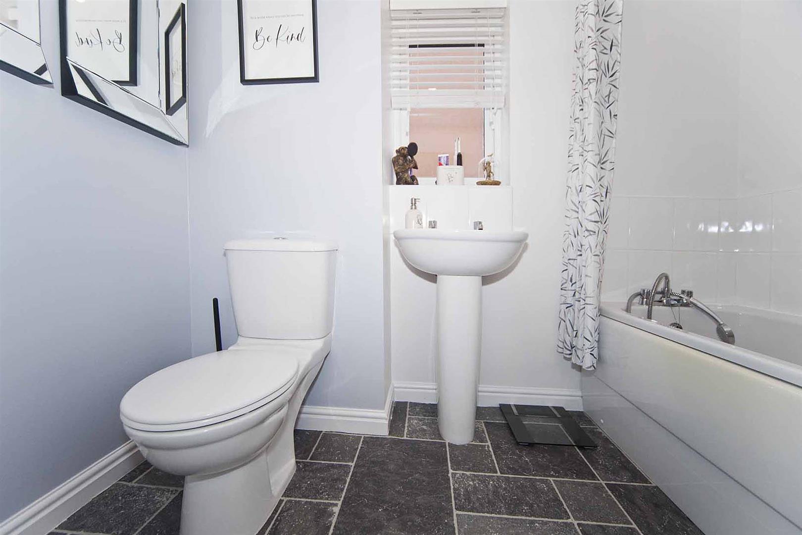 The family bathroom comprises bath with showerhead taps, close coupled WC and pedestal wash basin, complementary tiling, pastel decor.