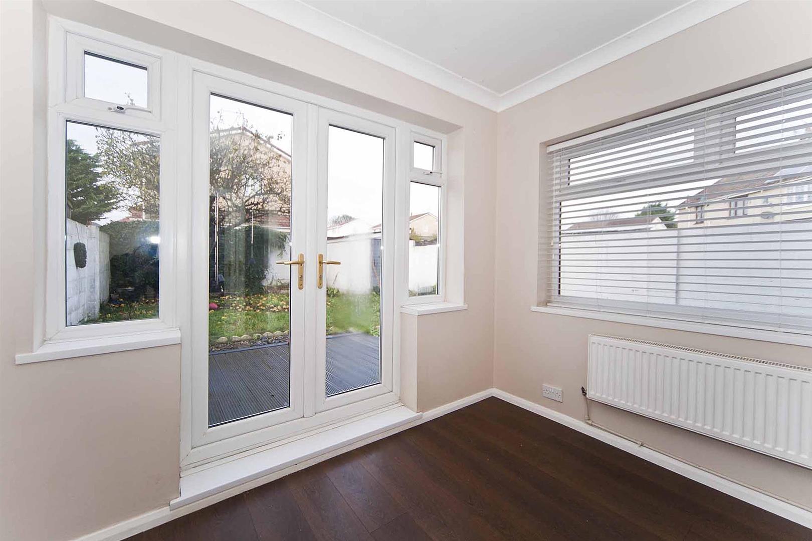 Garden room with laminate flooring, dual aspect windows and French doors opening to the rear garden, decorative coving, modern decor.