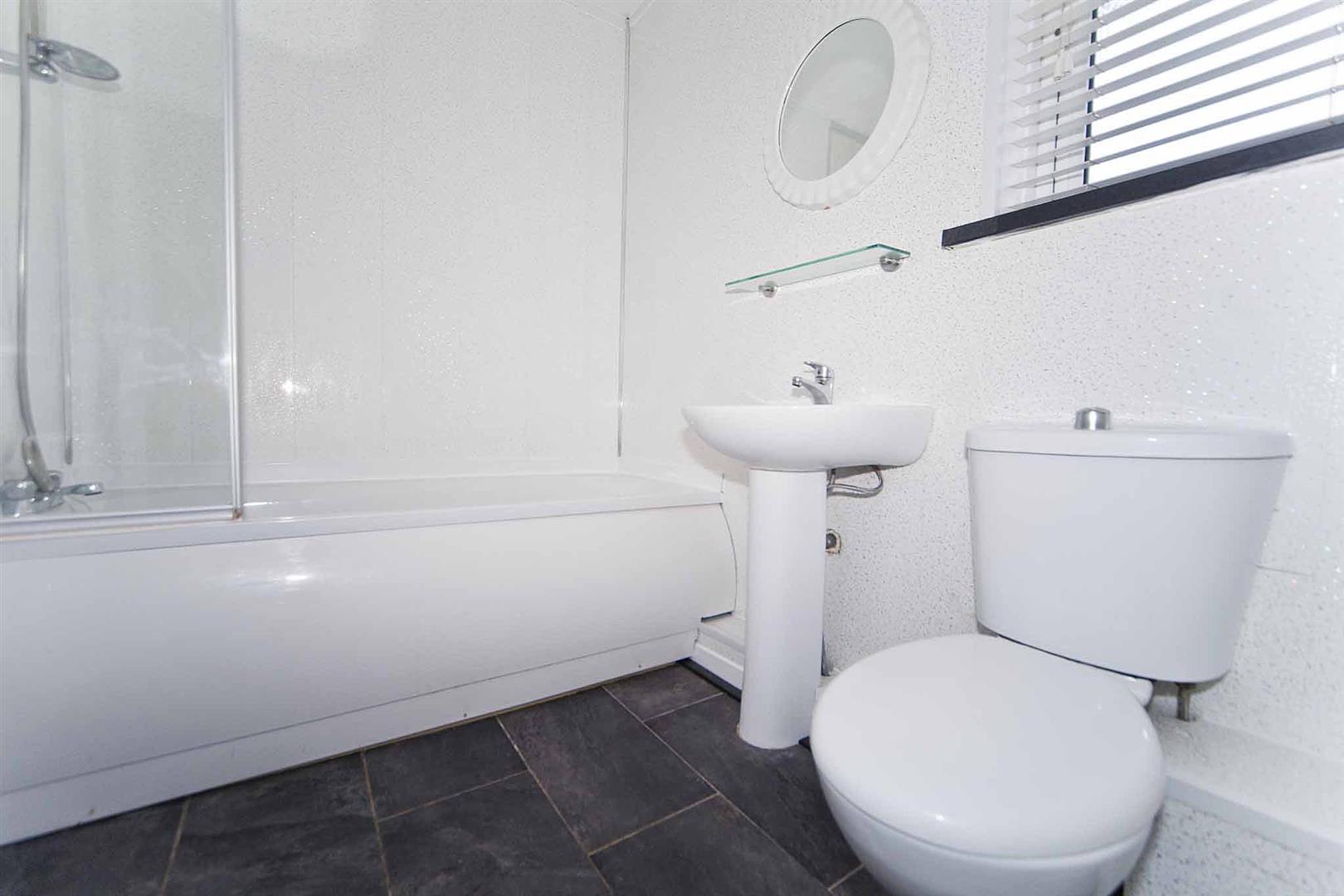 The modern family bathroom comprises bath, over bath shower, close coupled WC and pedestal wash basin, wall panelling.