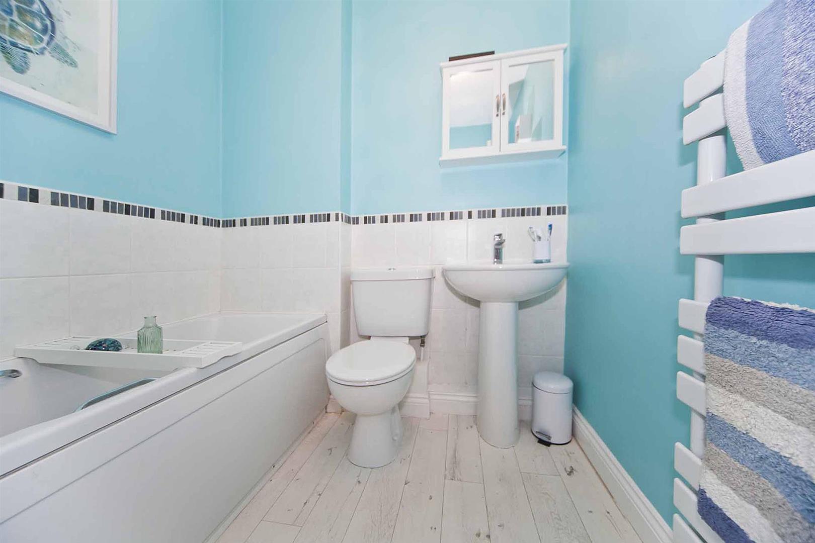 Family bathroom comprising bath, WC and wash basin, complementary tiling, heated towel radiator.