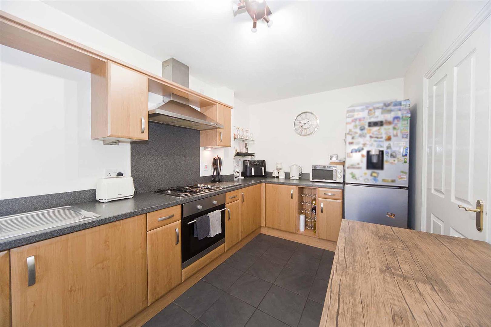 Modern breakfasting kitchen fitted with wall, base and drawer cabinetry, fitted wine rack, complementary surfaces, integrated oven, integrated gas hob, integrated extractor, stainless one and a half bowl sink with mixer tap, space for fridge freezer, plumbing for washing machine, tiled floor.