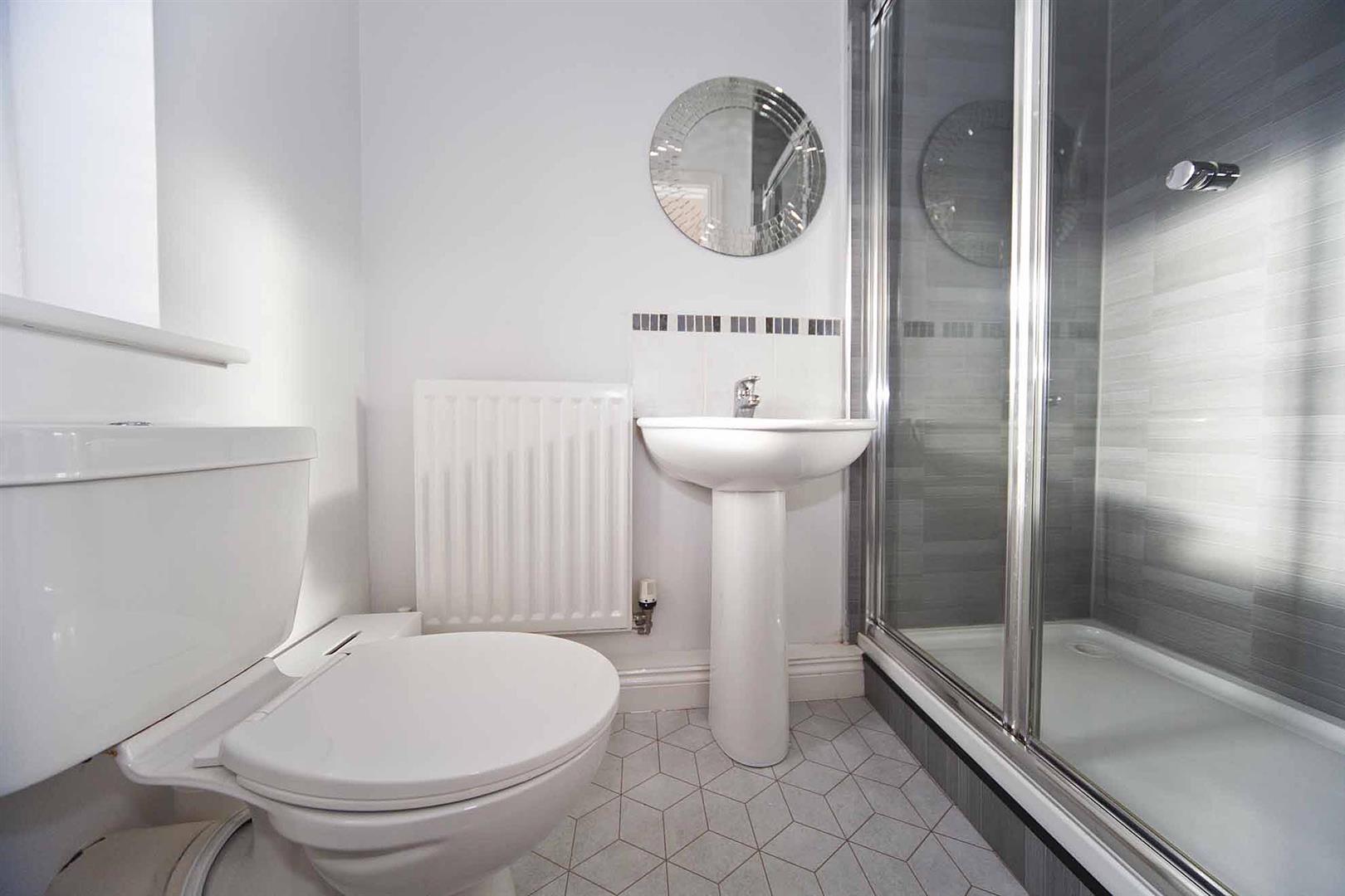 Ensuite shower room comprising oversized shower enclosure, close coupled WC and pedestal wash basin, complimentary tiling