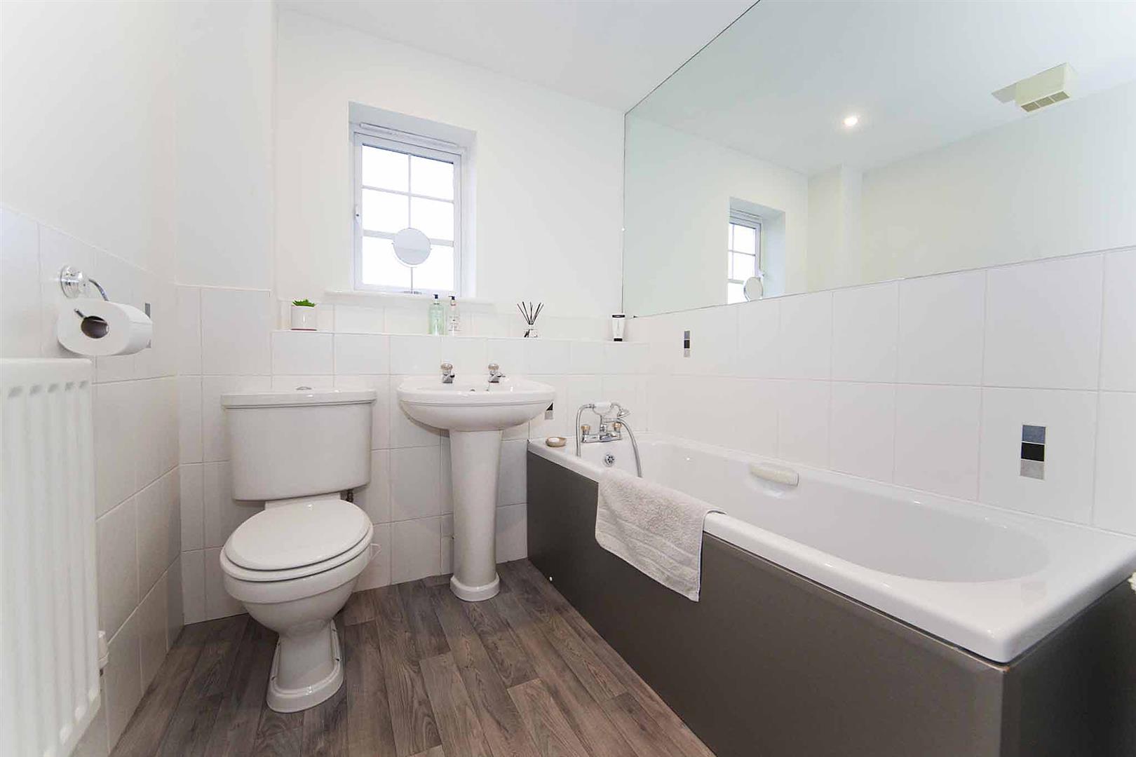 The family bathroom comprises bath, shower head taps, close coupled WC and pedestal wash basin, complimentary tiling, half mirrored wall, recessed spotlights.