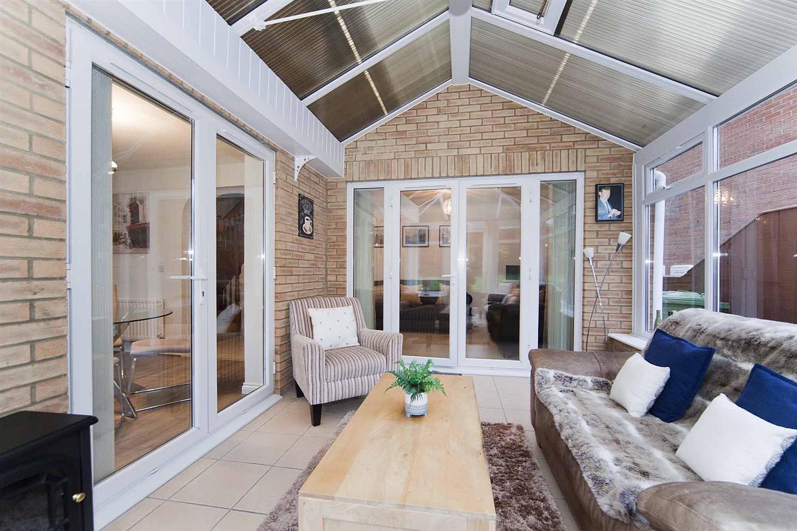 Sunny conservatory with tiled floor, French doors which open up to the rear garden.
