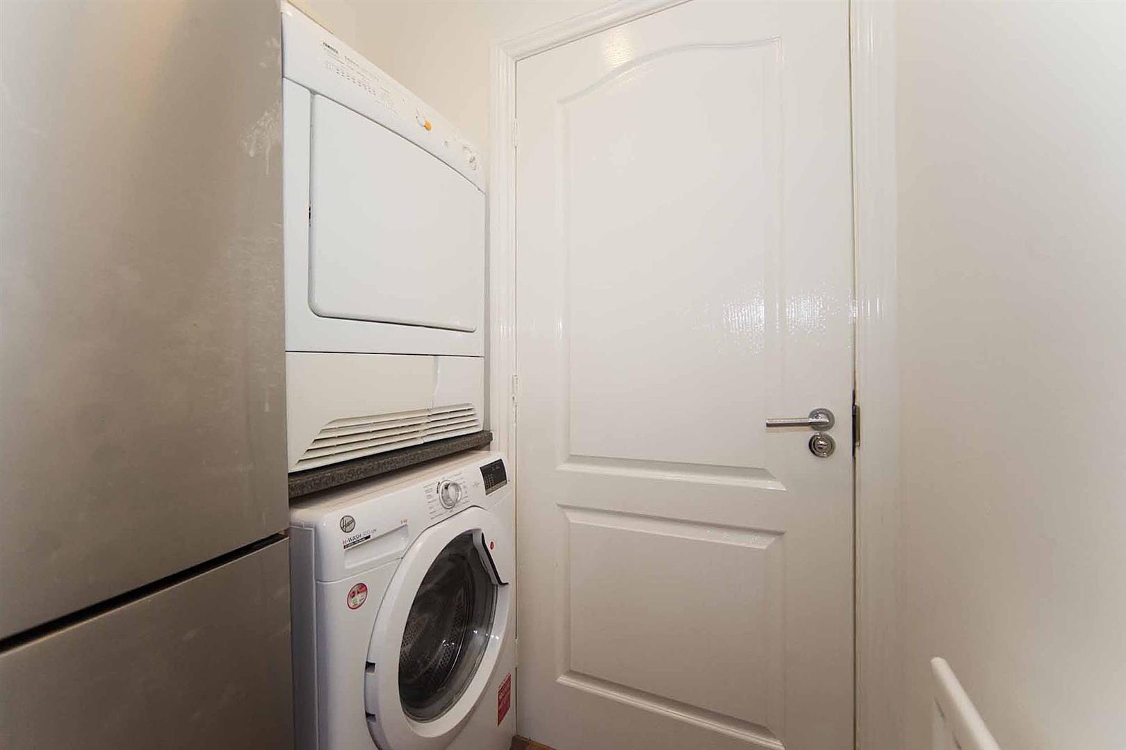 Utility room with plumbing for washing machine, space for tumble dryer, space for fridge freezer.