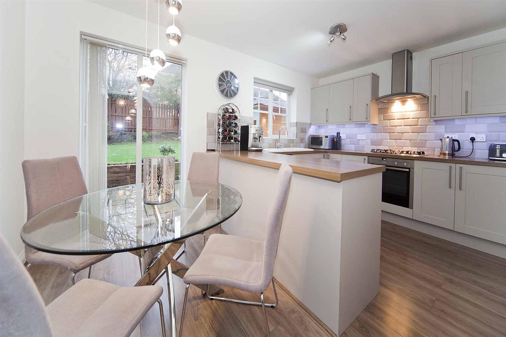 Superb open plan kitchen diner with ample space to dine and the kitchen is fitted with shaker style wall, base and drawer cabinetry, complimentary surfaces, stylish subway tiling, integrated oven, integrated gas hob, integrated stainless multifunction extractor, ceramic sink with chrome mixer tap, space for dishwasher, breakfast bar, ample dining area, door leading into;