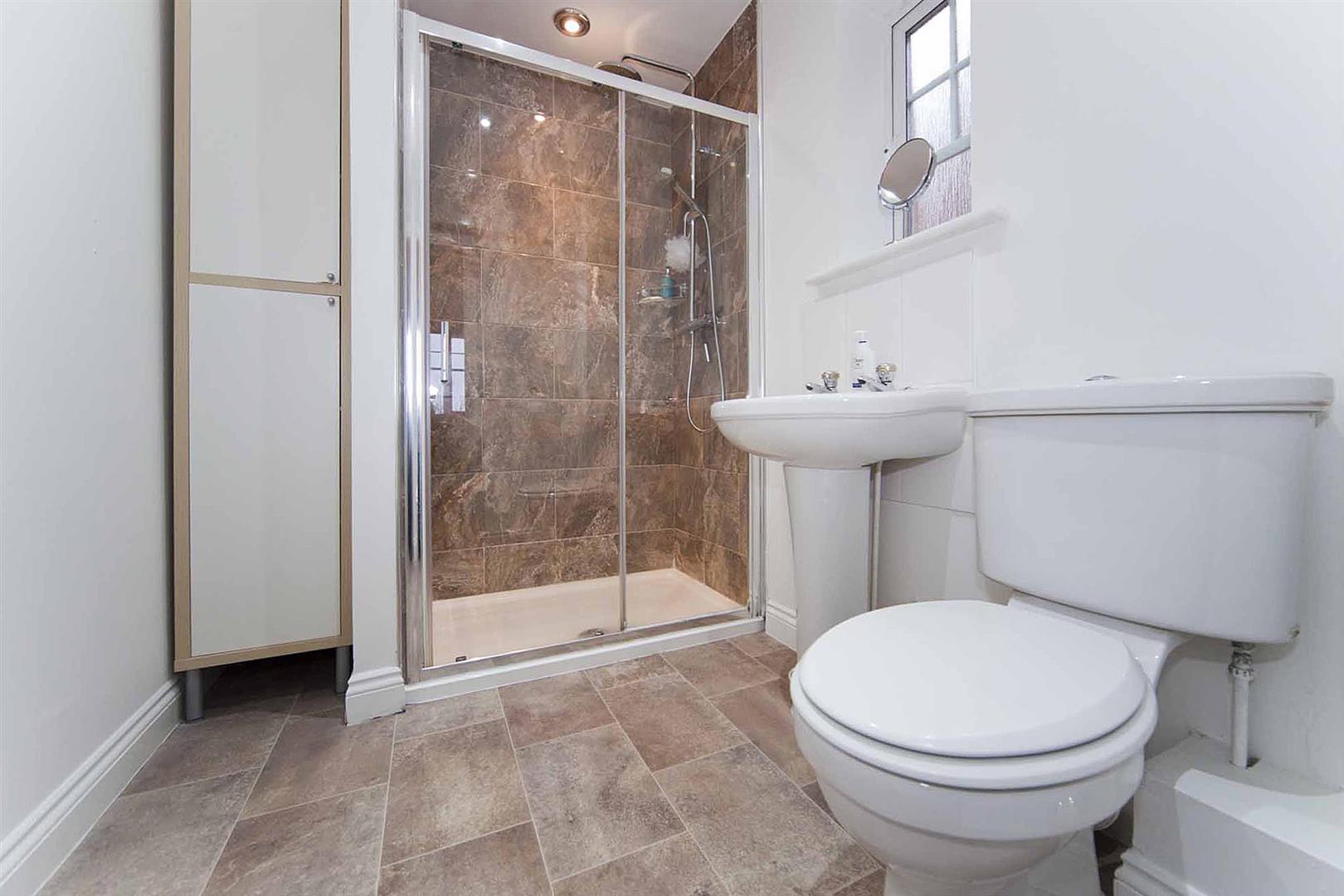 Superb ensuite shower room comprising close coupled WC, pedestal wash basin and oversized shower and enclosure, complimentary tiling.