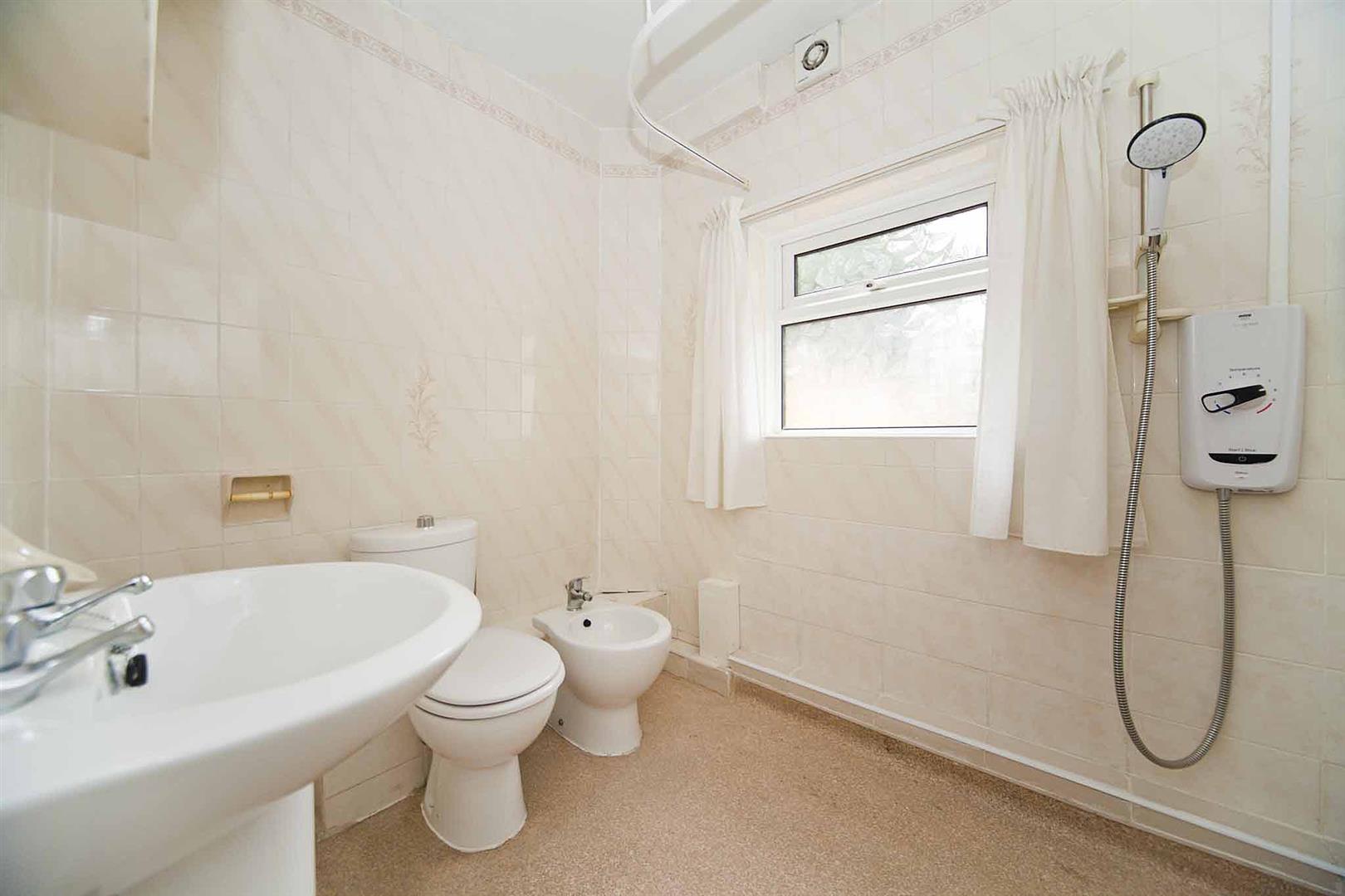 The family shower room/wet room comprises shower, close coupled WC, bidet and pedestal wash basin with complimentary tiling and anti-slip flooring.