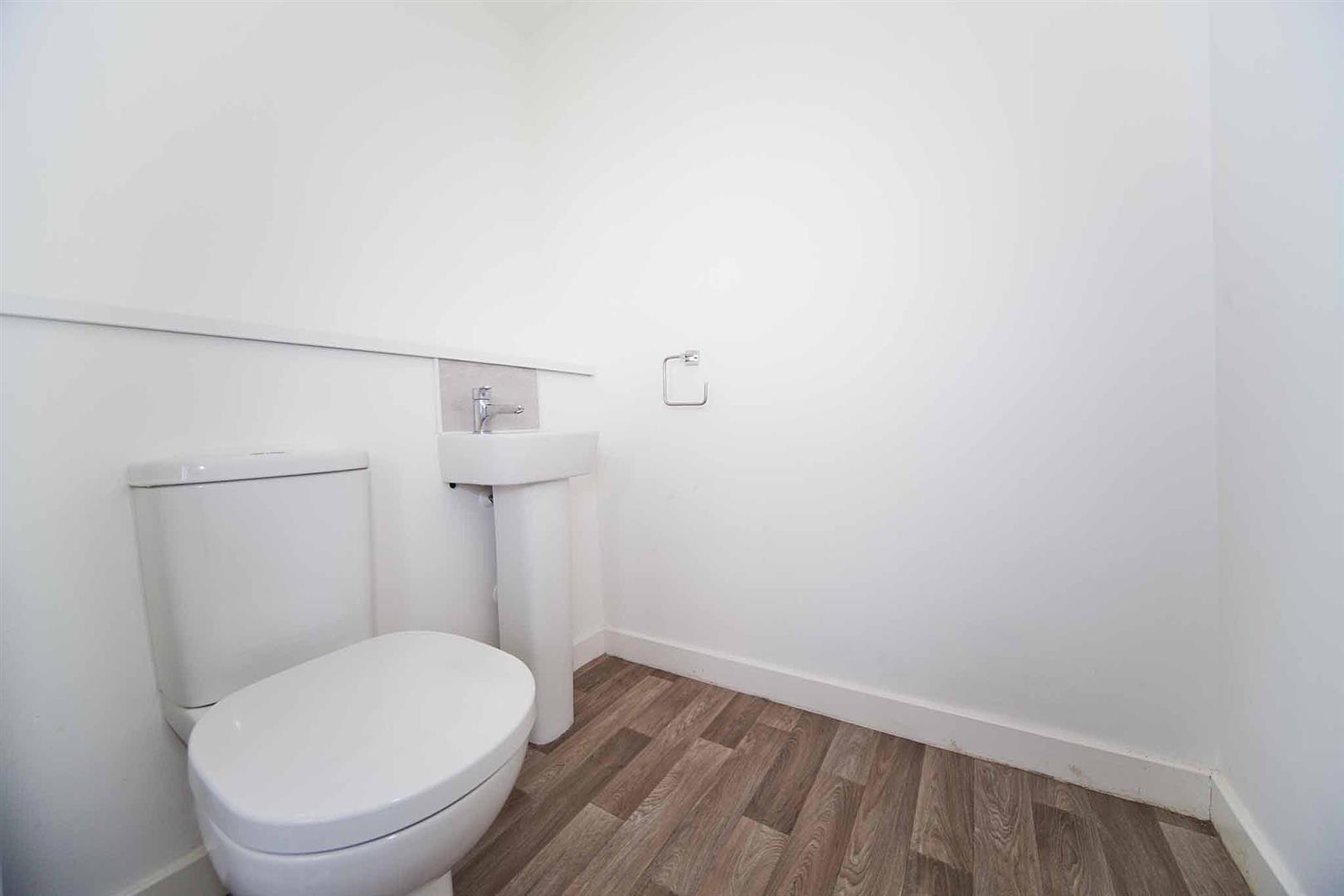 Guest cloakroom comprising close coupled WC and pedestal wash basin with complementary tiled backsplash.