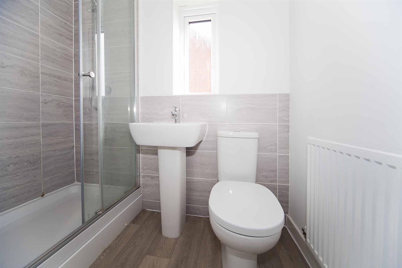 Ensuite shower room which comprises oversized shower enclosure, close coupled WC and pedestal wash basin, complimentary tiling.