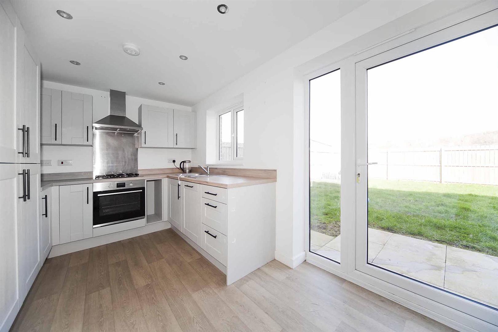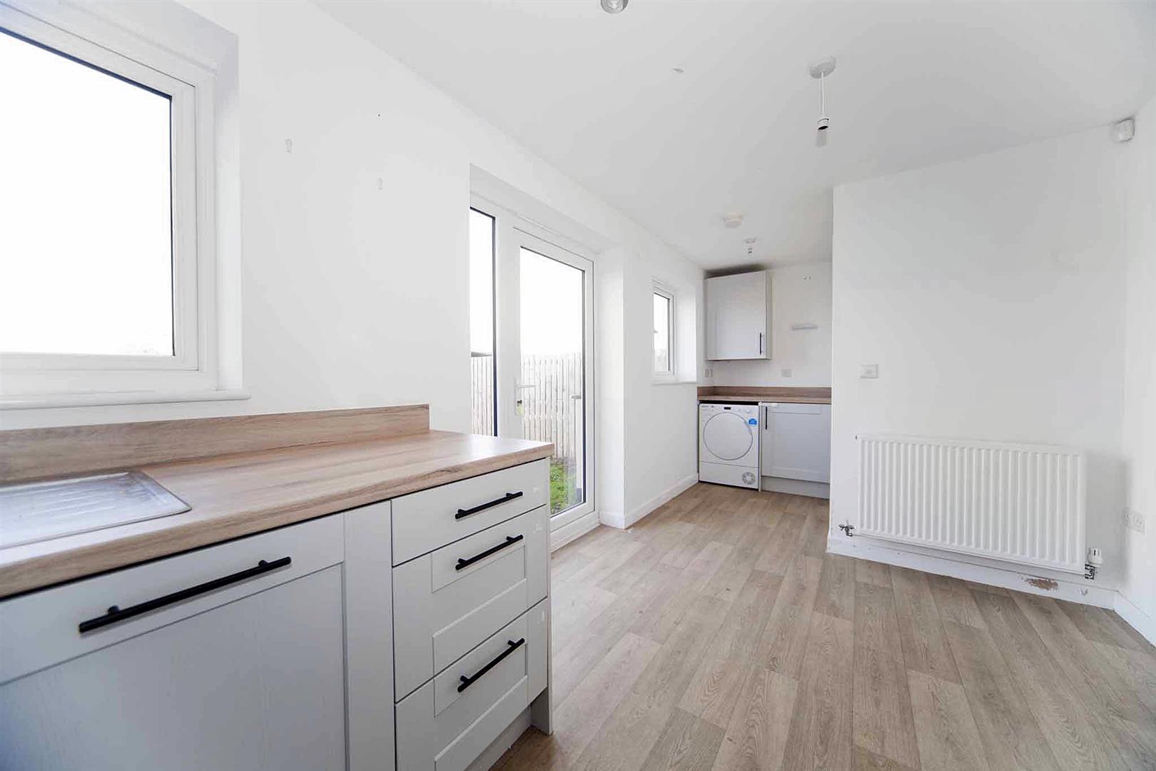 Open concept kitchen diner fitted with range of contemporary larder, wall, base, and drawer cabinetry, complimentary services, integrated oven, integrated gas hob, integrated stainless multifunction extractor and coordinating backslash, stainless one and a half bowl sink with chrome mixer tap, integrated fridge freezer, integrated dishwasher, integrated washing machine, space for tumble dryer, space to dine, laminate flooring, immaculate decor, door opening to the rear garden.