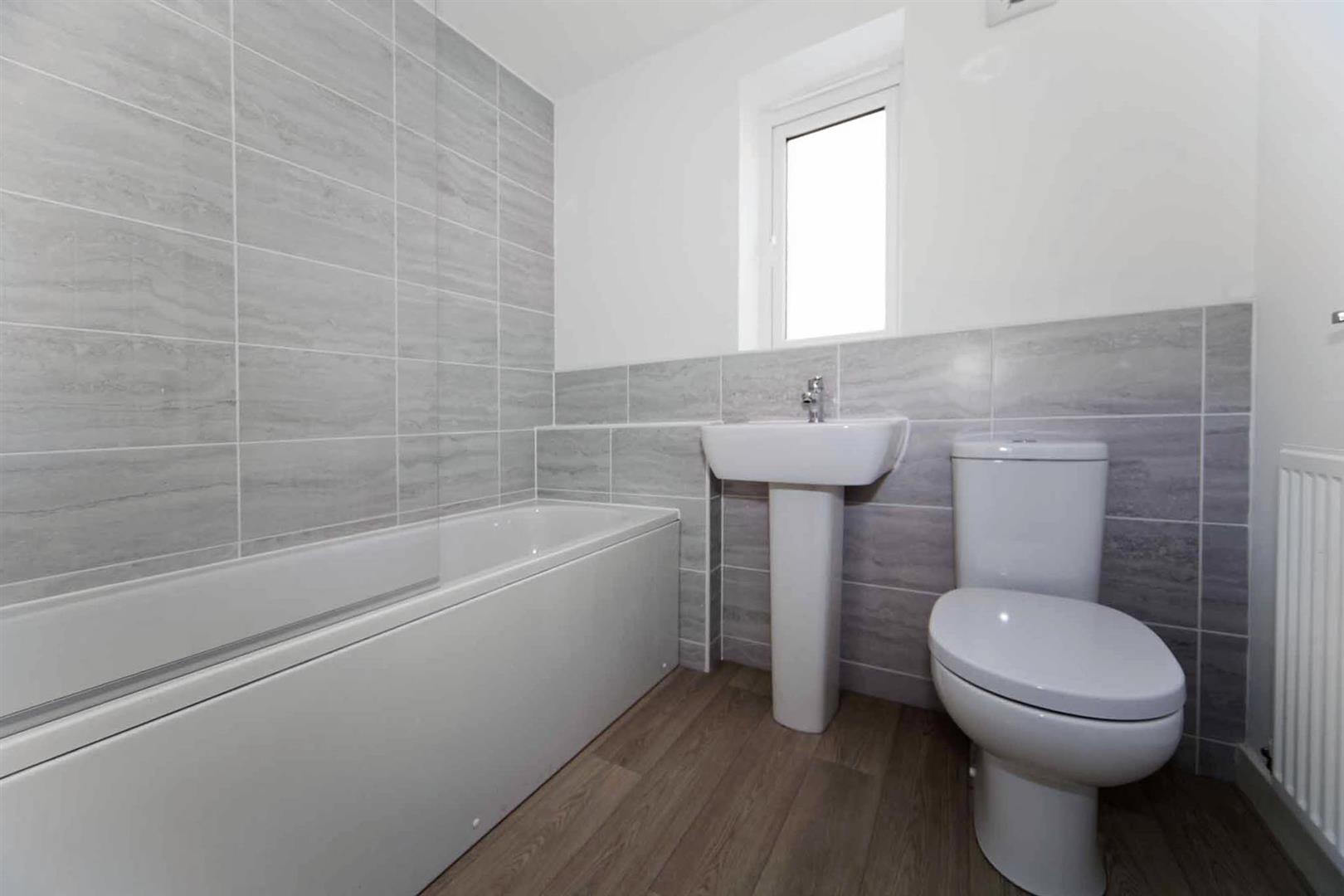Family bathroom which comprises bath, over bath shower, close coupled WC and pedestal wash basin with complimentary tiling.