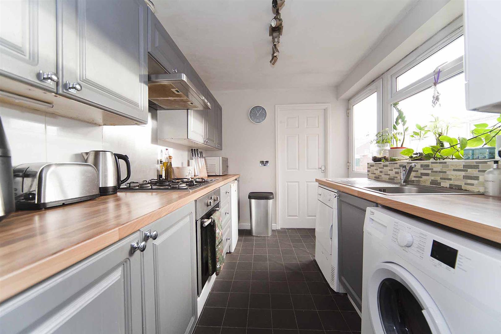 Well equipped kitchen comprising wall, base and drawer cabinetry, complimentary surfaces, stainless sink with chrome mixer tap, integrated oven, integrated gas hob, integrated stainless extractor, plumbing for washing machine, space for tumble dryer, half glazed rear access door.