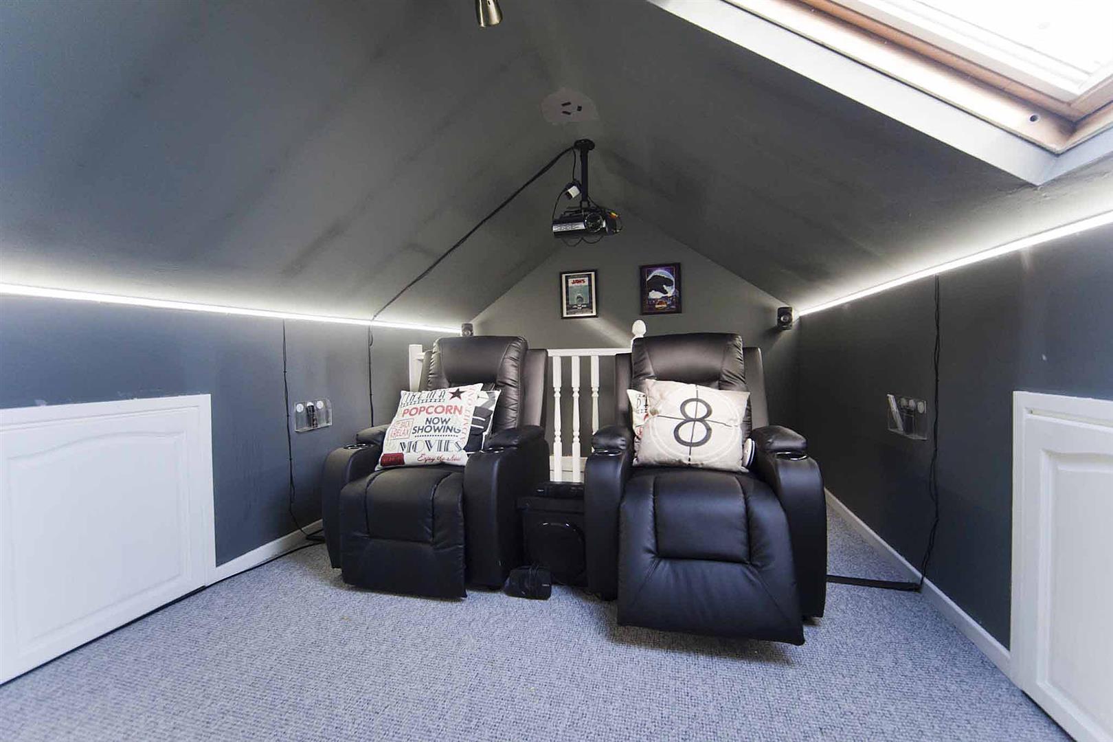To the second floor, there is a large loft conversion with Velux window to the rear, vaulted ceiling, eaves storage, contemporary decor, currently utilised as a cinema room.