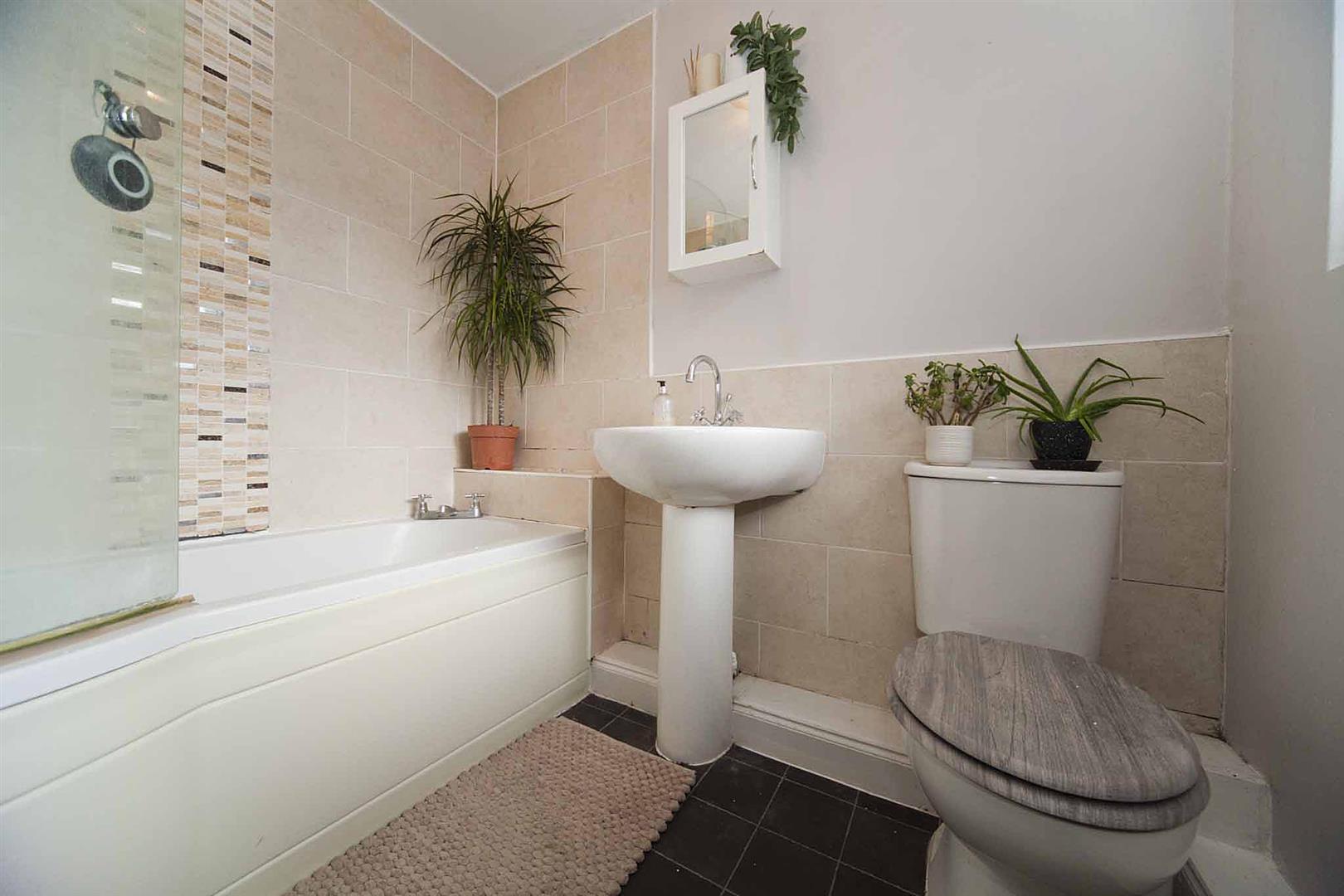 Modern family bathroom comprising bath, over bath shower, glass shower screen, close coupled WC, and pedestal wash basin, complimentary tiling.