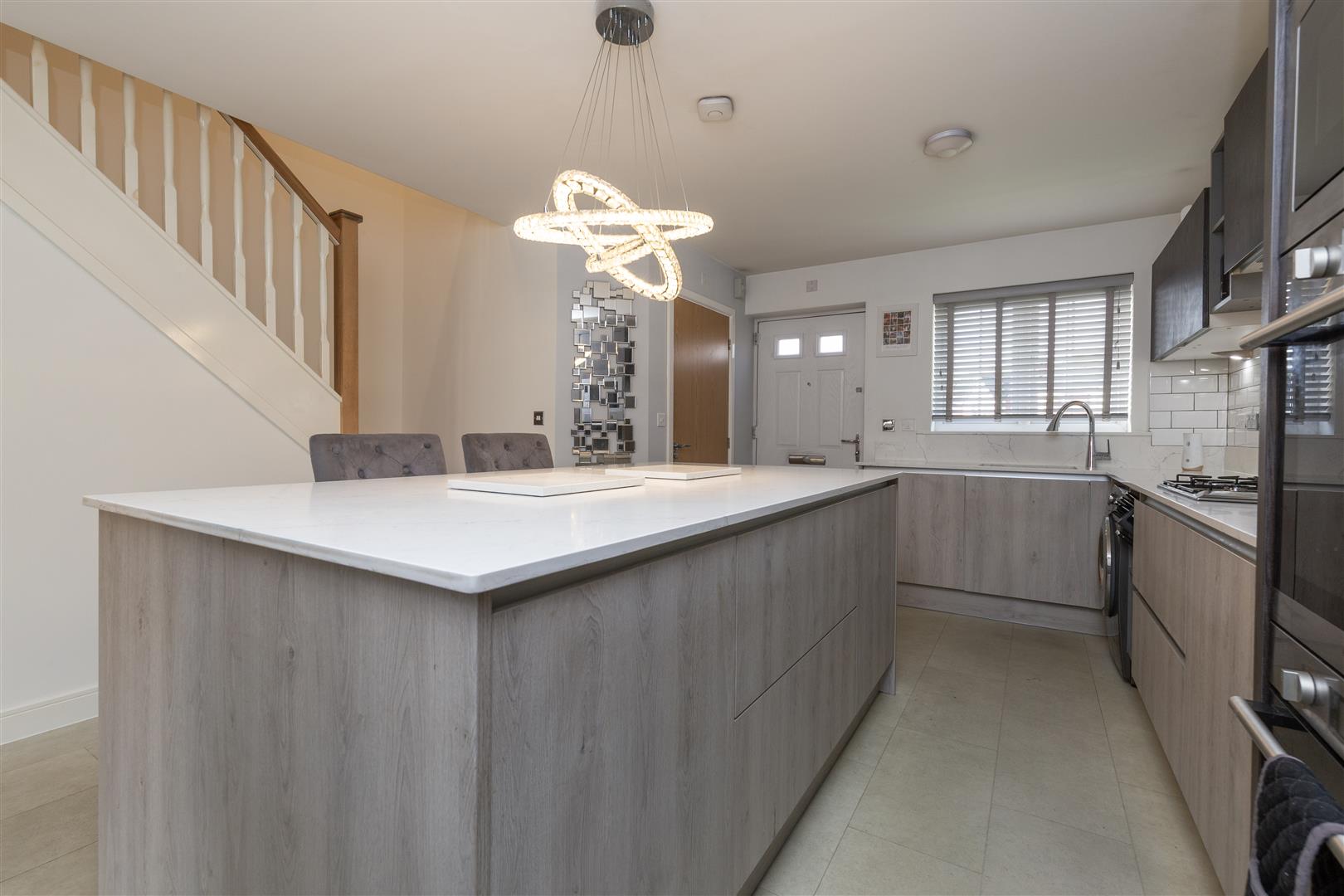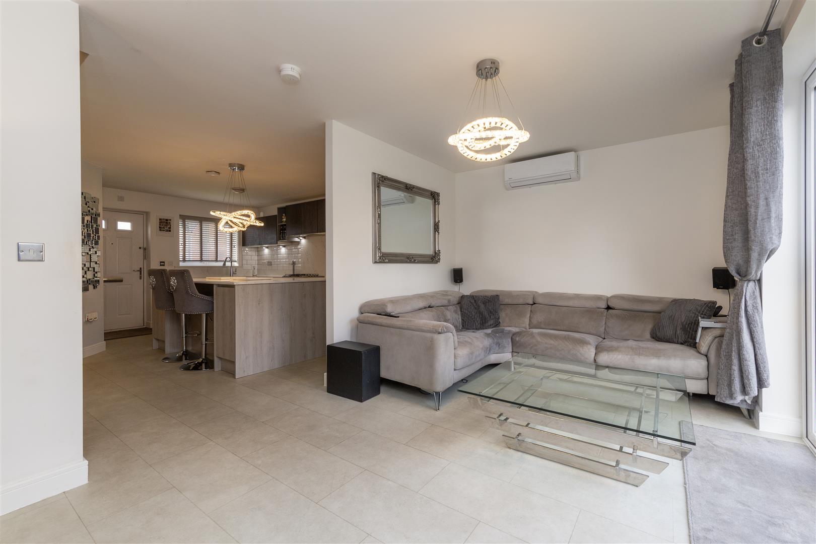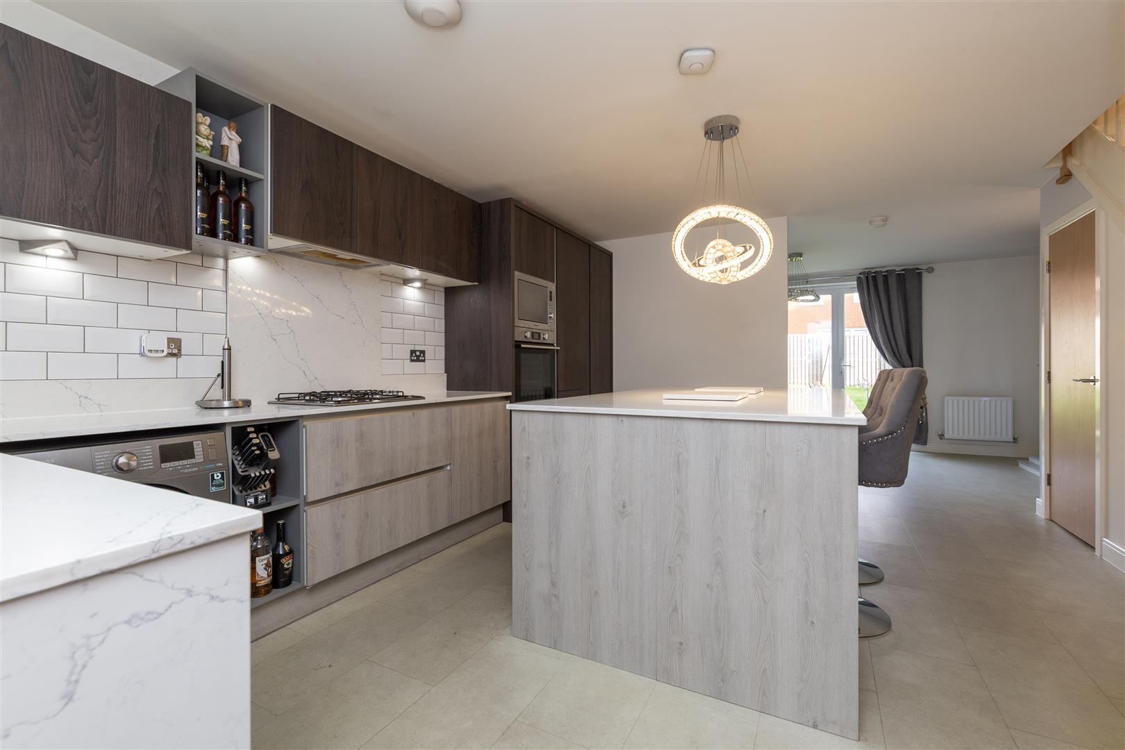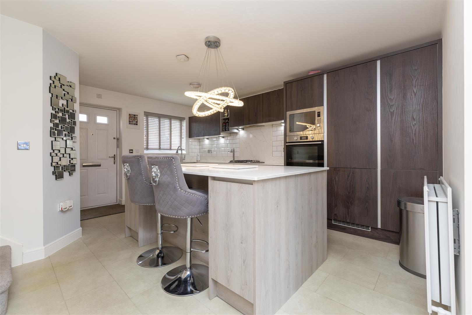 This imposing property with its bright brickwork has a lovely South facing position overlooking the green in this quiet family development. The front façade is laid to lawn with ample space on the large driveway for 2-3 cars. Through the front door into the large open plan living space, the elegant kitchen with its large central island with white granite counter tops and feature modern light fitting are all striking features of this modern space. The slick well-equipped kitchen with a combination of dark and light grey wood effect base, wall and drawer units, white tiled splash with fitted downlighters, has space saving integrated appliances, comprising of large integrated fridge freezer, two separate wall mounted ovens and integrated microwave, gas hob and extractor, the undercounter sink unit with modern mixer tap blend seamlessly into the workspace where space is aplenty. There is space for washing machine or dishwasher, plenty of deep drawers and even open shelving to add variety. The island has a breakfast bar area with space to dine. There is a front facing window fitted with venetian wood effect blinds, the floor throughout the kitchen and into the living area is luxury vinyl tiles in an off white, very practical and hard wearing. A door leads into the downstairs WC which is fitted with a white porcelain suite and wall mounted mirror with a window to the front.