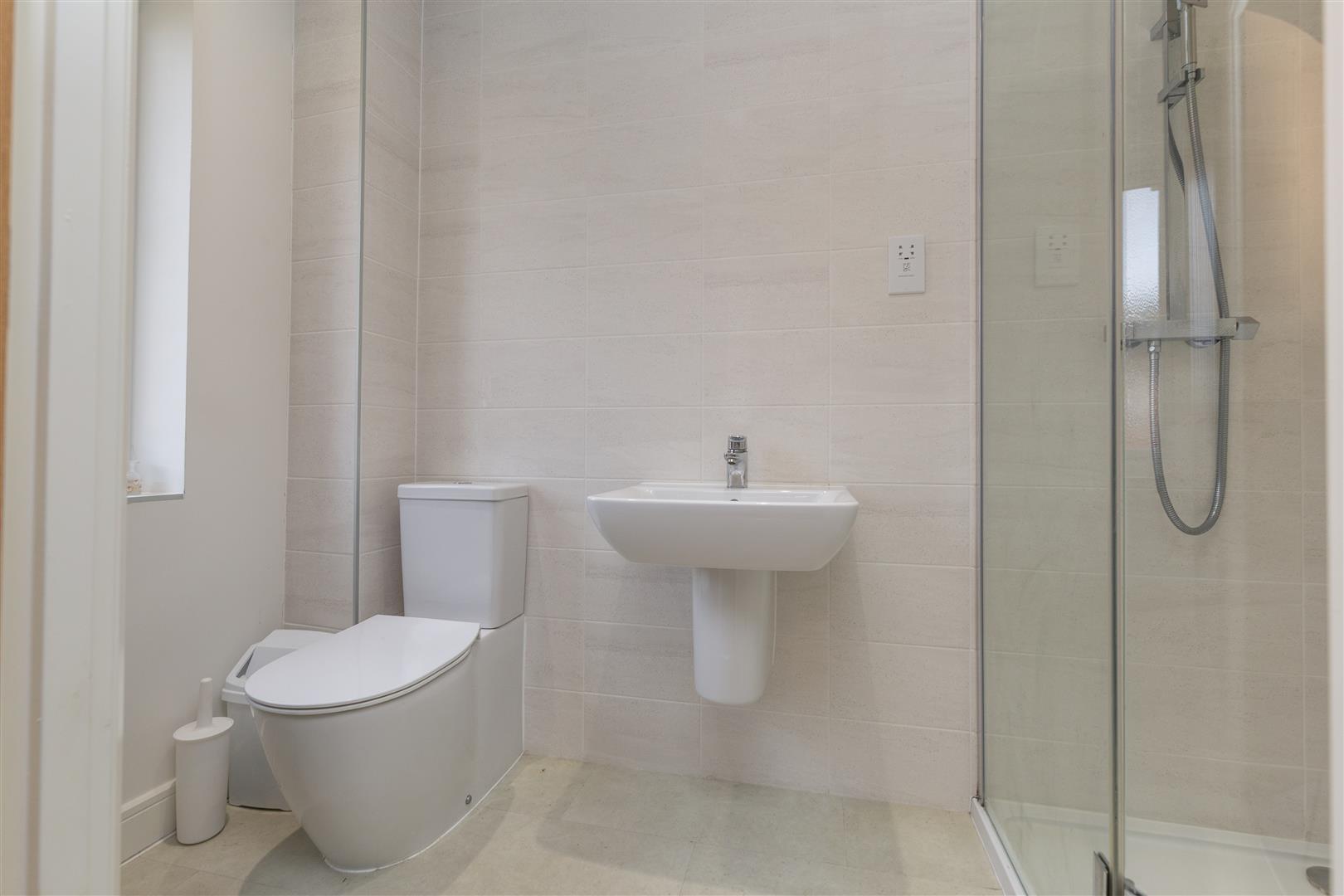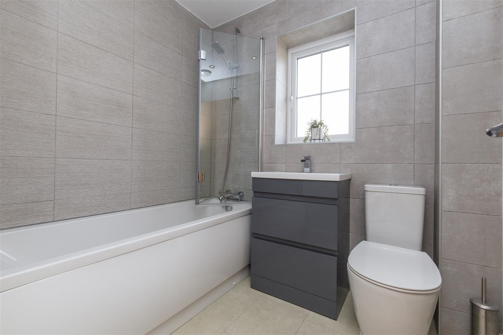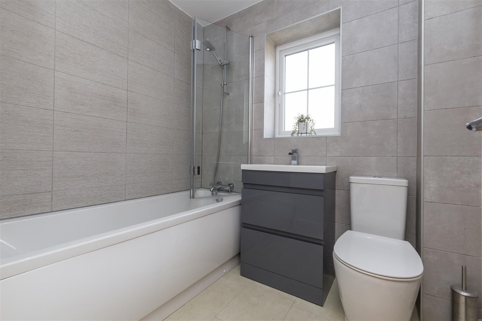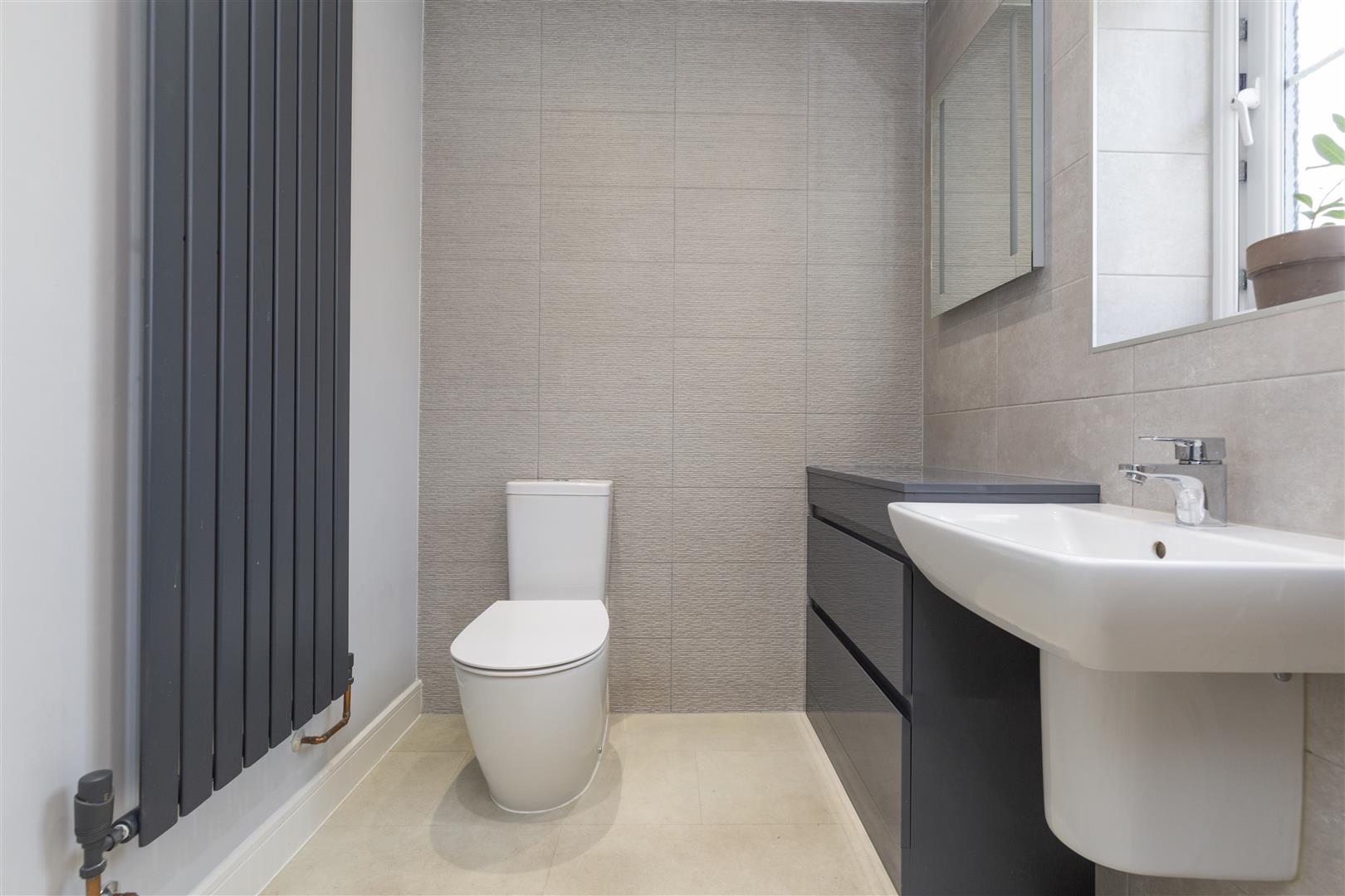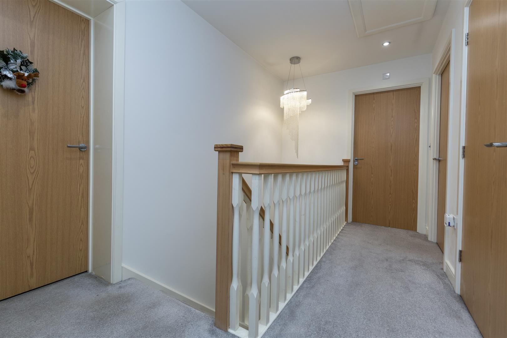 This imposing property with its bright brickwork has a lovely South facing position overlooking the green in this quiet family development. The front façade is laid to lawn with ample space on the large driveway for 2-3 cars. Through the front door into the large open plan living space, the elegant kitchen with its large central island with white granite counter tops and feature modern light fitting are all striking features of this modern space. The slick well-equipped kitchen with a combination of dark and light grey wood effect base, wall and drawer units, white tiled splash with fitted downlighters, has space saving integrated appliances, comprising of large integrated fridge freezer, two separate wall mounted ovens and integrated microwave, gas hob and extractor, the undercounter sink unit with modern mixer tap blend seamlessly into the workspace where space is aplenty. There is space for washing machine or dishwasher, plenty of deep drawers and even open shelving to add variety. The island has a breakfast bar area with space to dine. There is a front facing window fitted with venetian wood effect blinds, the floor throughout the kitchen and into the living area is luxury vinyl tiles in an off white, very practical and hard wearing. A door leads into the downstairs WC which is fitted with a white porcelain suite and wall mounted mirror with a window to the front.