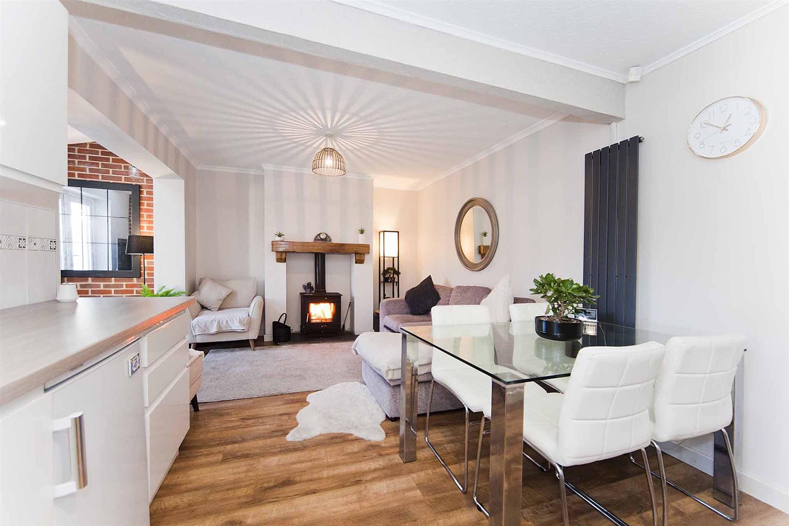 Open plan kitchen/diner/family room extended and recently refitted to offer sleek wall, drawer and base cabinetry, complimentary surfaces, tiled backsplash, space for oven, stainless sink with chrome mixer tap, space for fridge, space for washing machine, ample space to dine and with family room seating area, French doors opening to the rear garden, two x Velux windows, anthracite column radiator, dual fuel fire with wooden over mantle and slate hearth, laminate flooring, feature brick walls.