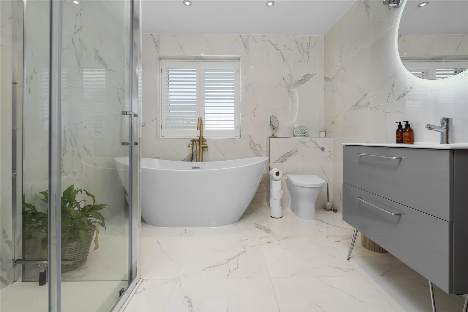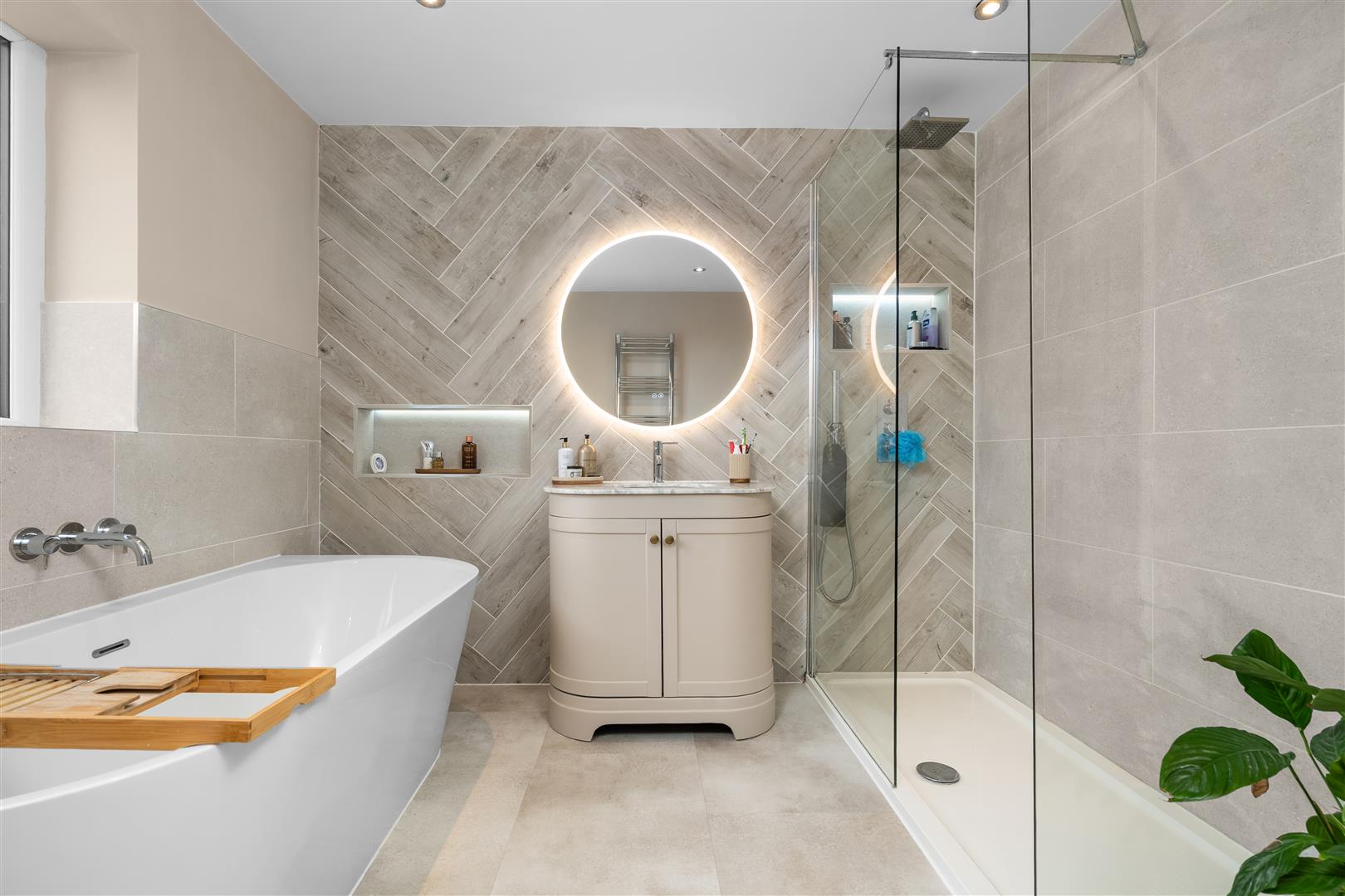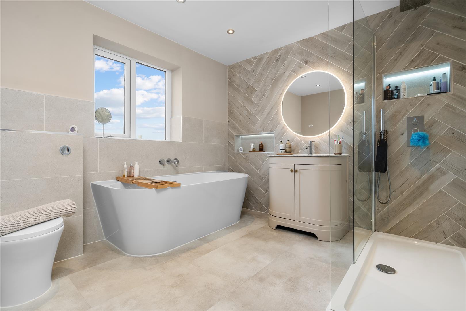 The family bathroom comprises freestanding bath, double shower enclosure, vanity wash basin and concealed cistern WC, stunning tiling, illuminated mirror, recessed spotlights.