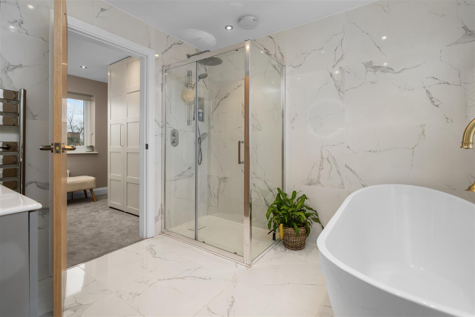 Fabulous en suite bathroom which comprises freestanding slipper bath, oversized shower enclosure, concealed cistern WC, and stylish vanity wash basin, beautiful marble tiling, illuminated mirror, recessed spotlights, heated towel radiator.