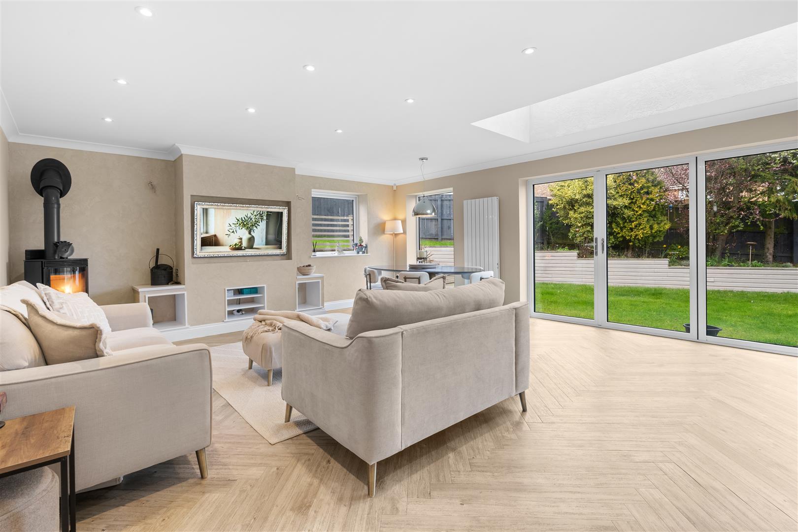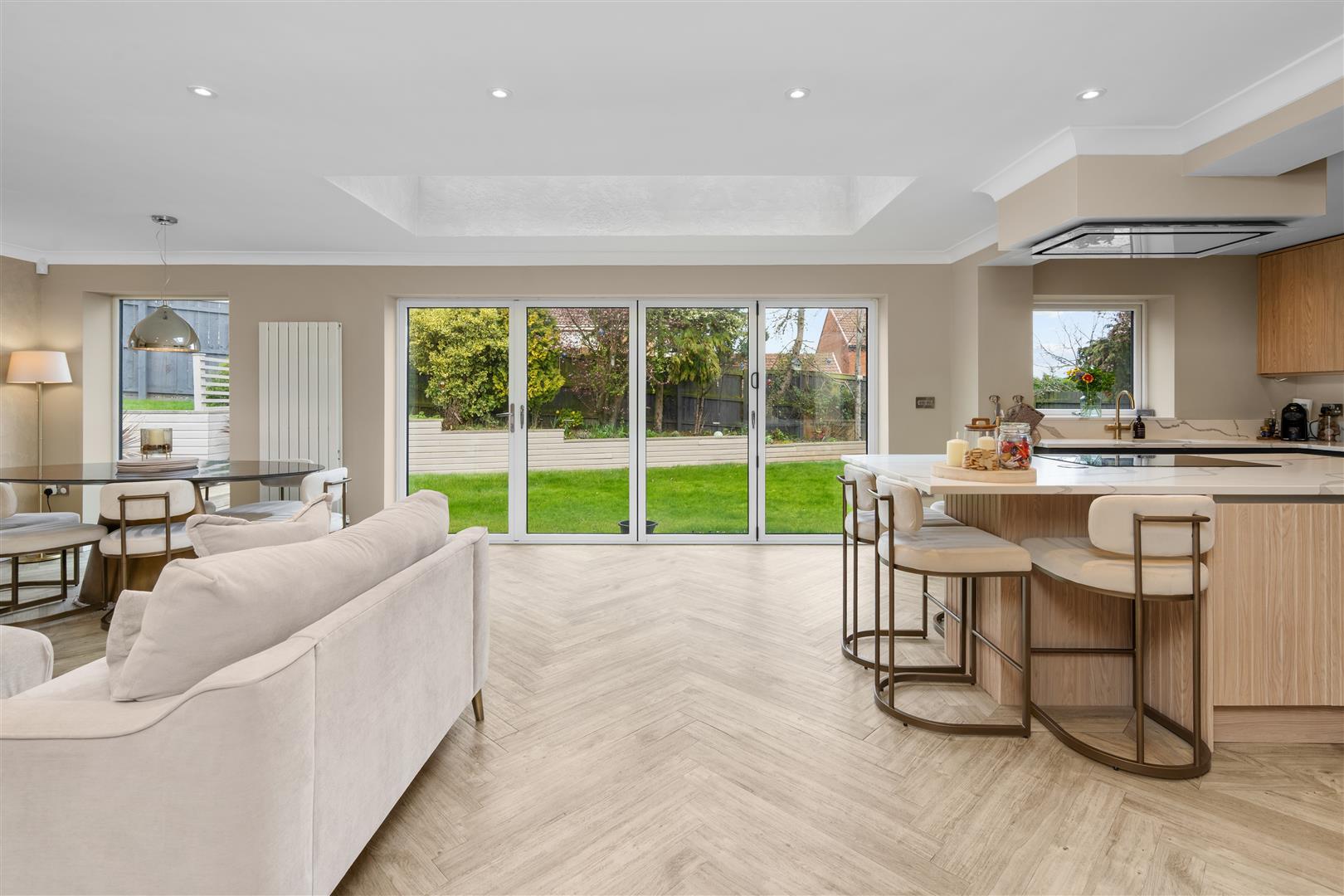 Awesome open concept kitchen/dining/family room which is fitted with an range of larder, wall, base, and drawer cabinetry, solid marble surfaces, fabulous central breakfasting island, integrated oven, integrated ceramic hob, integrated microwave, integrated concealed extractor, inset sink with mixer tap, instant hot water tap, integrated full size fridge, integrated full size freezer, integrated wine cooler, ample dining space, ample seating space, dual fuel burner, recessed spotlights, beautiful herringbone floor, column radiators, roof lantern, windows and bifold doors opening to the rear.