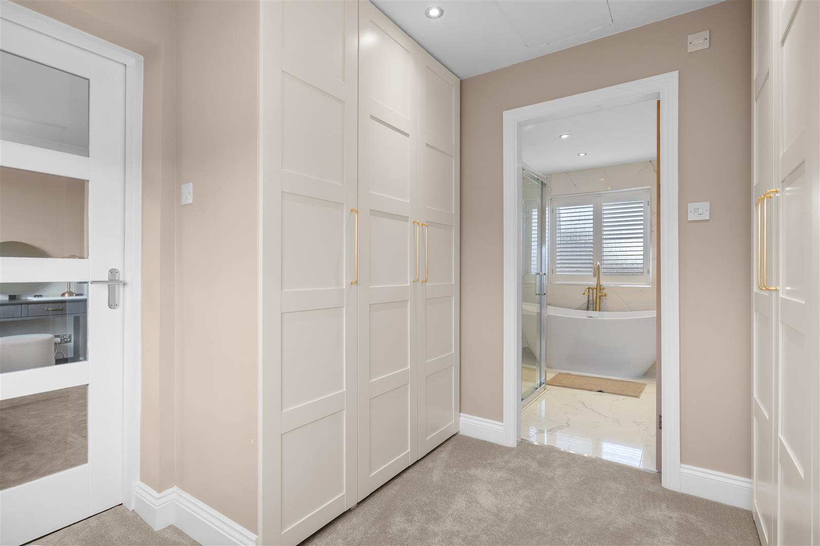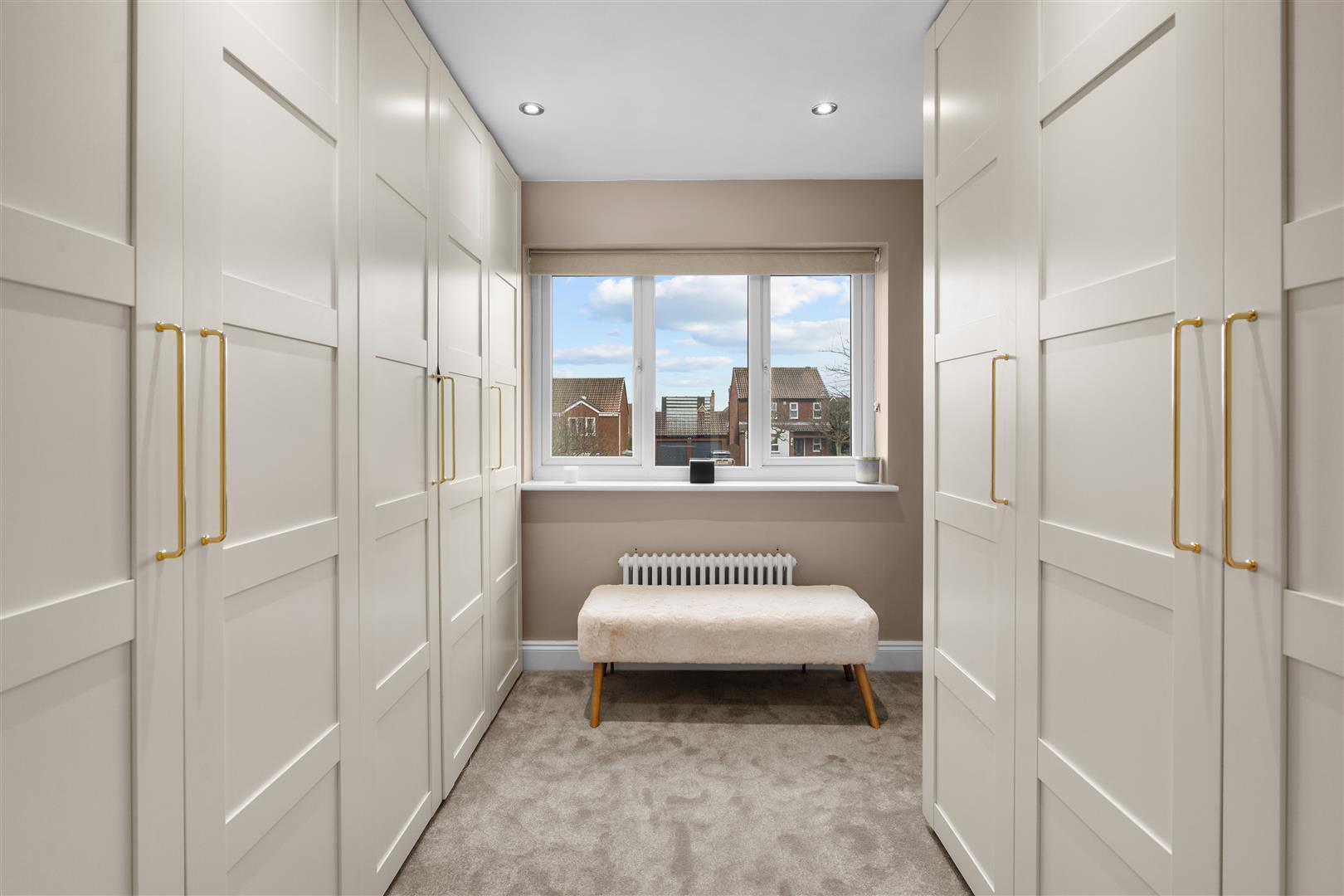 Walk in dressing room with front elevation window, fitted with contemporary cabinetry.