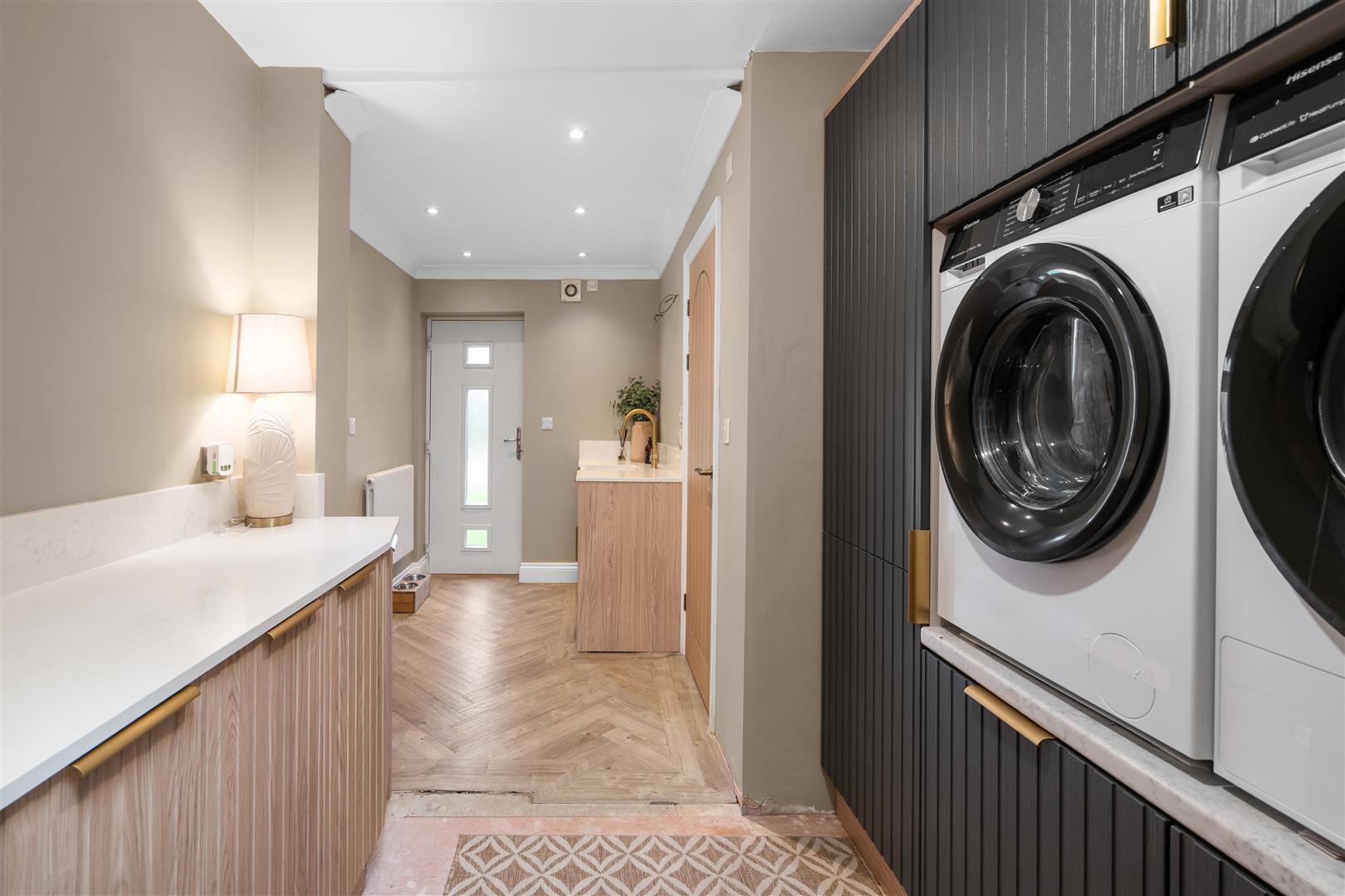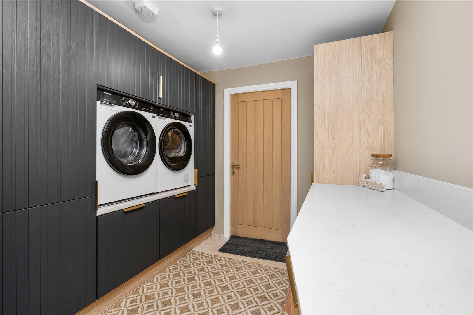Utility room with plumbing for washing machine and space for tumble dryer, and an array of wall, base and larder cabinetry, ceramic butler's sink with mixer tap, recessed spotlights, rear access door.