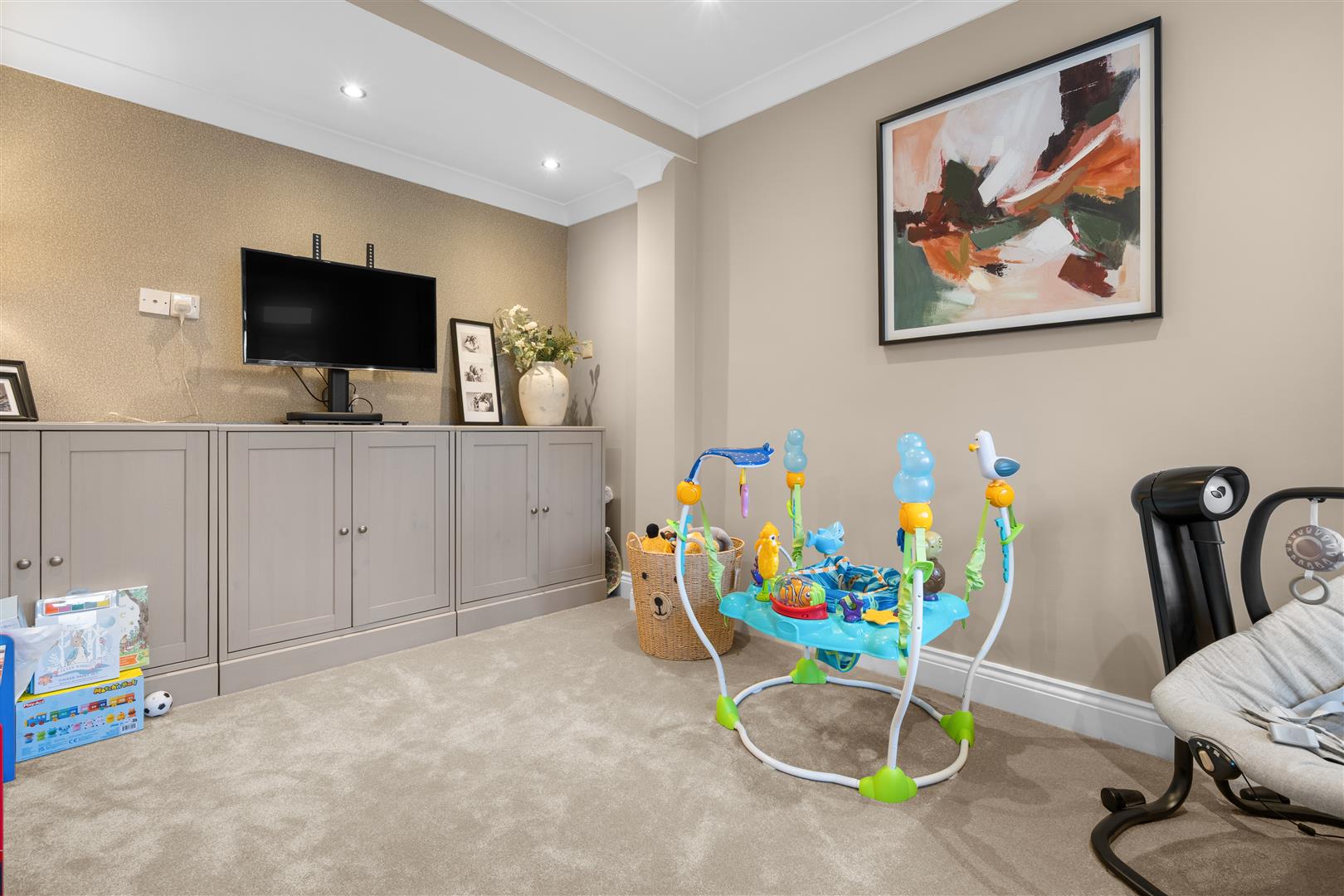 Study or playroom located to the front of the property (formally the garage), entered via double doors from the hallway and benefitting from a bow window to the front elevation, recessed spotlights, immaculate decor, bespoke fitted cabinetry.