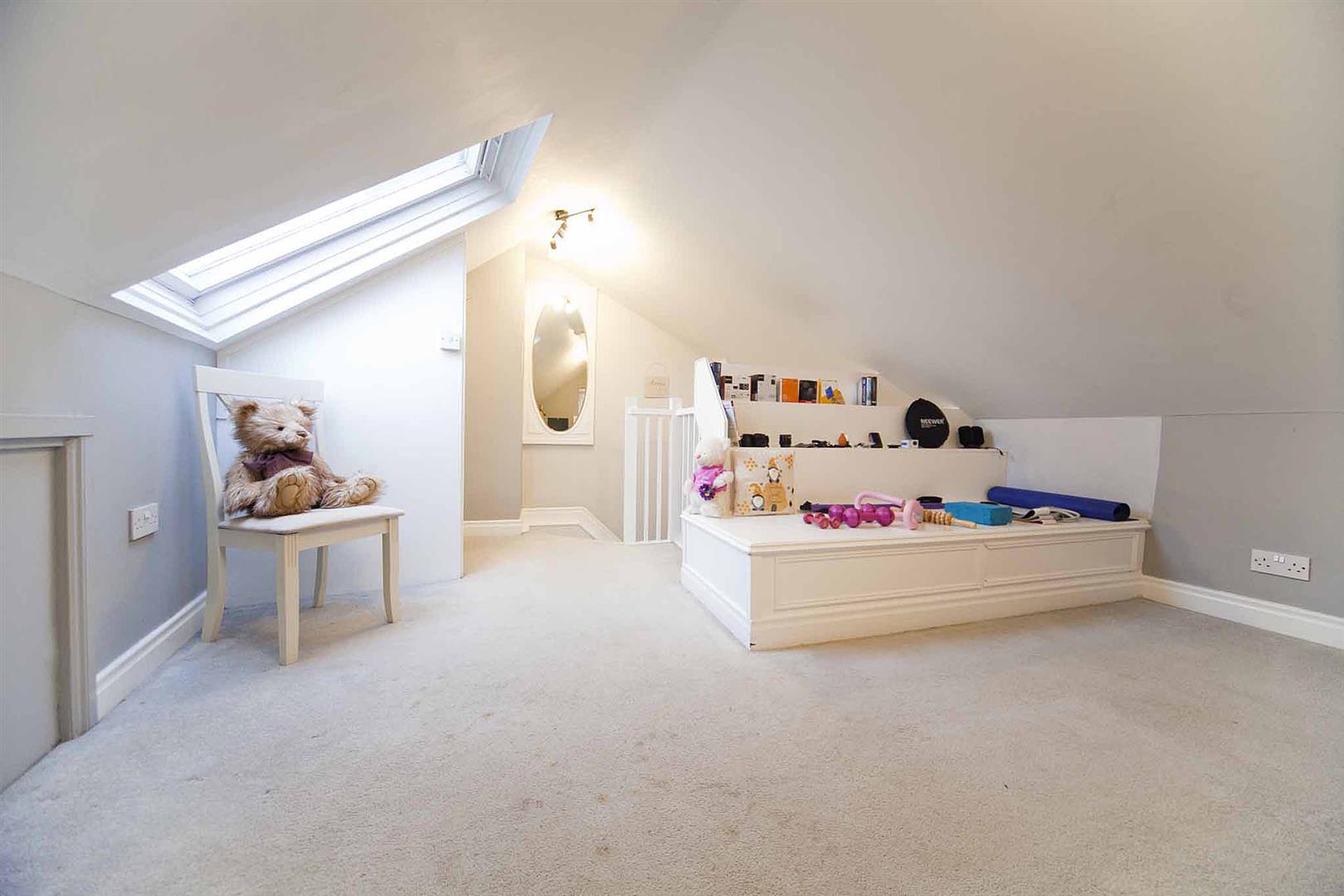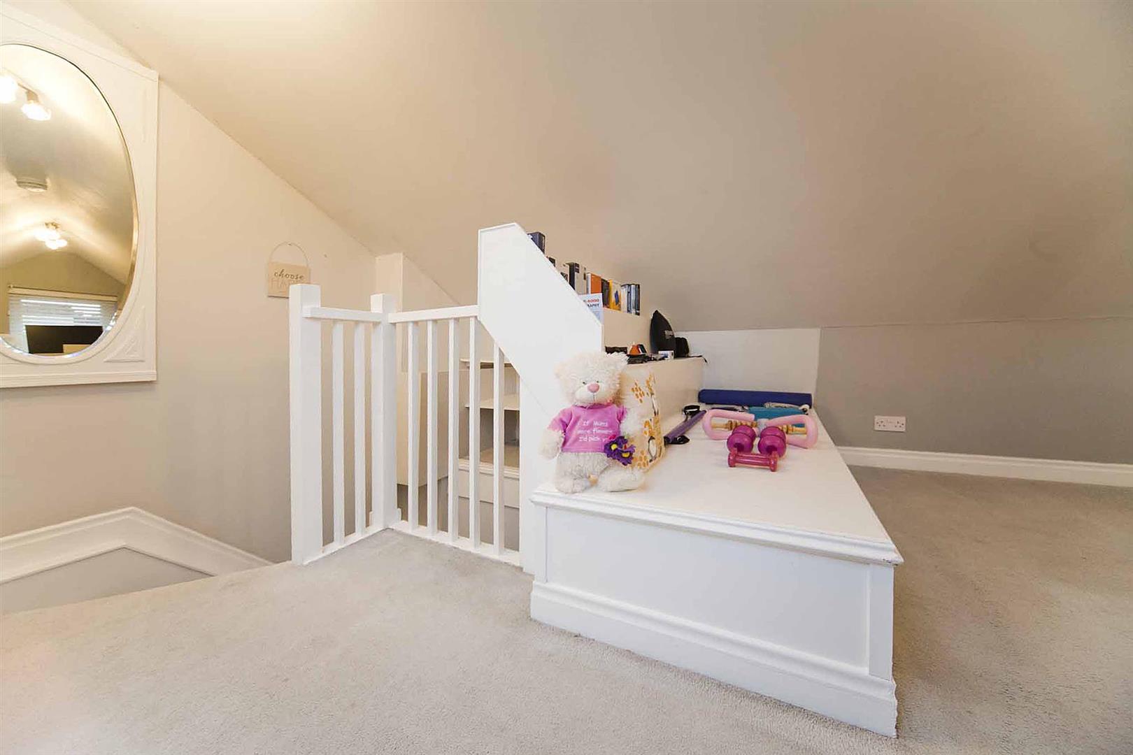 Loft space accessed via stairs with vaulted ceiling, eaves storage, velux window and additional window.