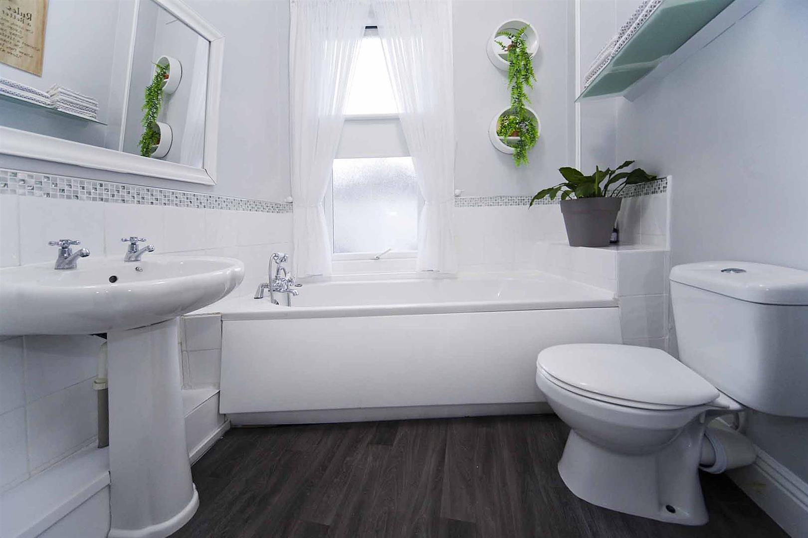 The family bathroom comprises shower enclosure, bath, WC, and wash basin, complimentary tiling, heated towel radiator.