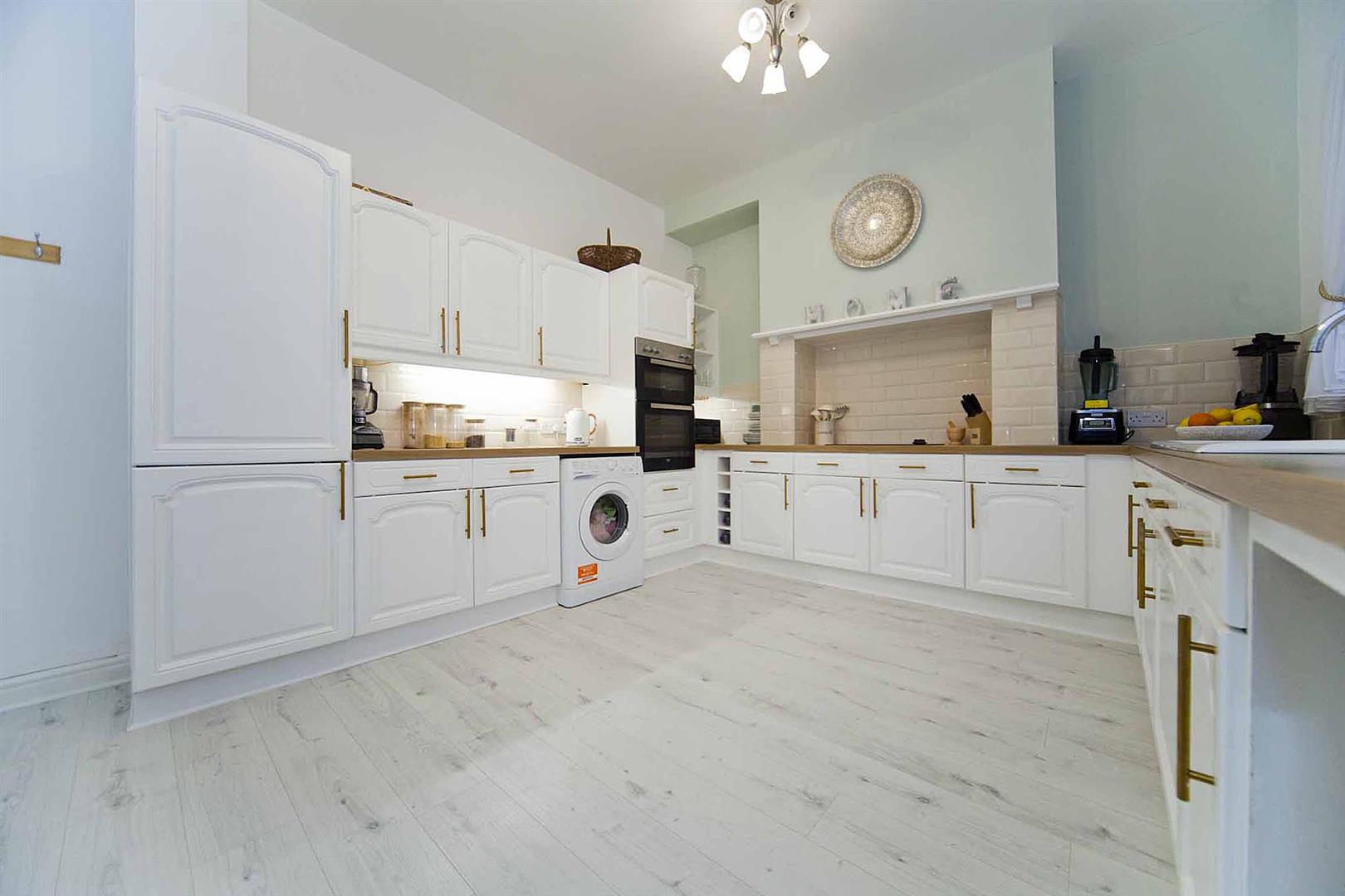 Large kitchen comprising wall, larder, base, and drawer line cabinetry, cabinet lighting, wine rack, complimentary surfaces, subway tiling, integrated double oven, integrated ceramic hob, sink with chrome mixer tap, plumbing for washing machine, space for fridge freezer, laminate flooring, wall lights, pastel decor, leading into;