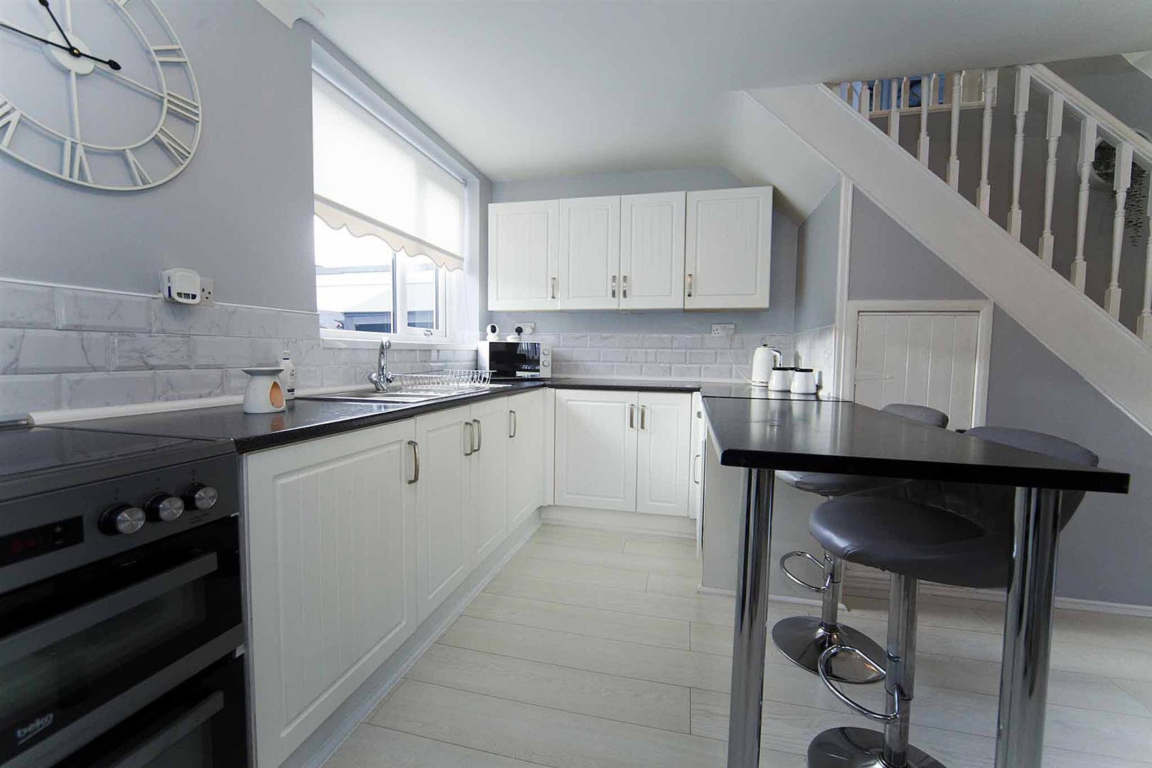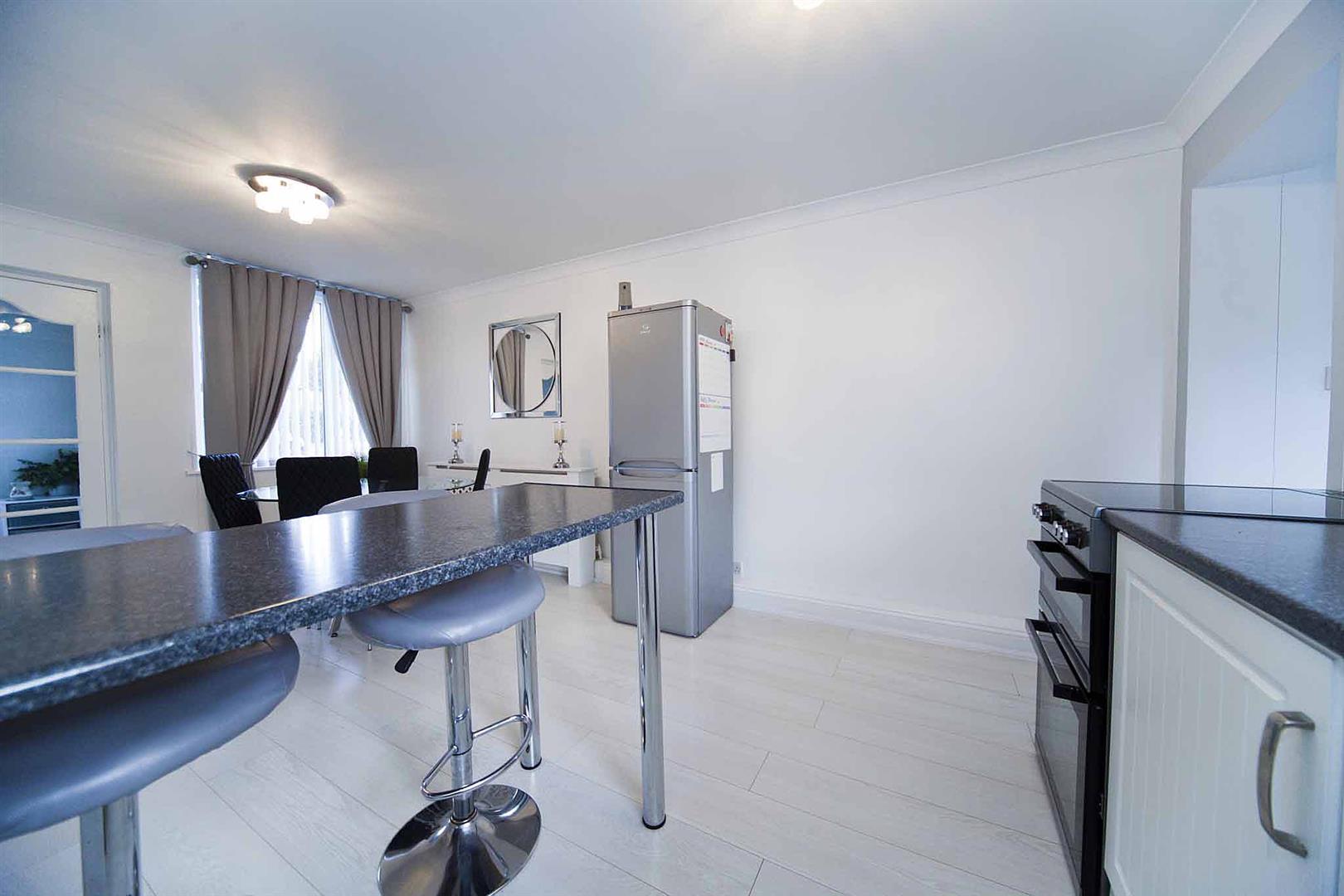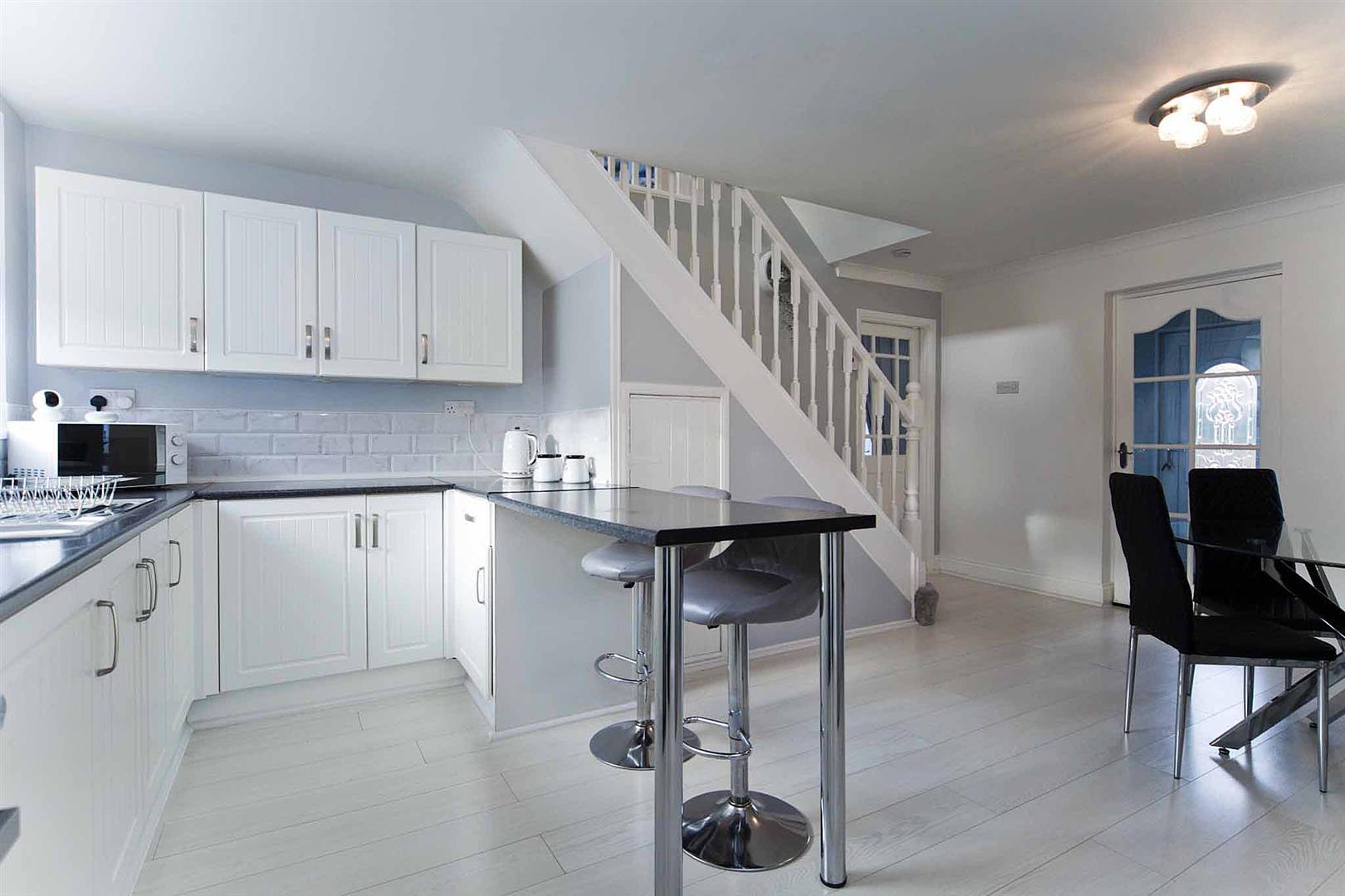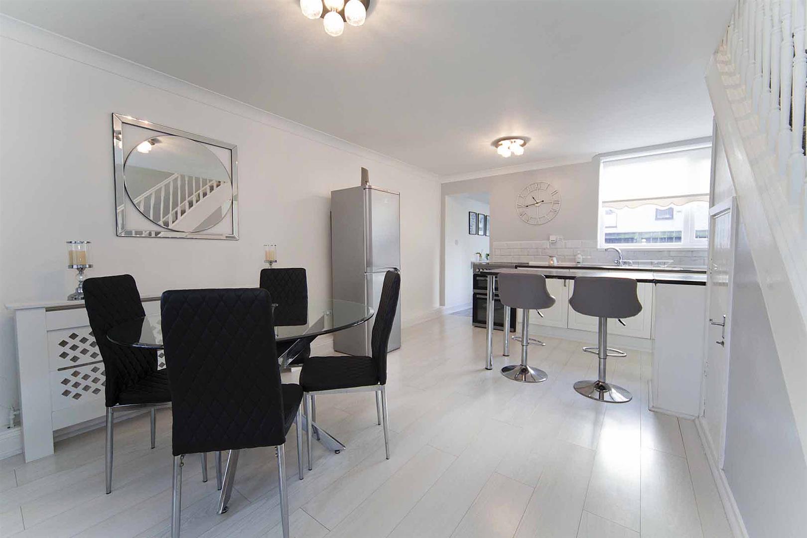 Open plan kitchen diner comprising stylish wall and base cabinetry, complementary surfaces, breakfast bar, subway tiled backsplash, space for oven, space for appliances, ample space to dine, laminate flooring, immaculate decor, decorative coving, stairs to the first floor accommodation, under stairs fitted storage cupboard.