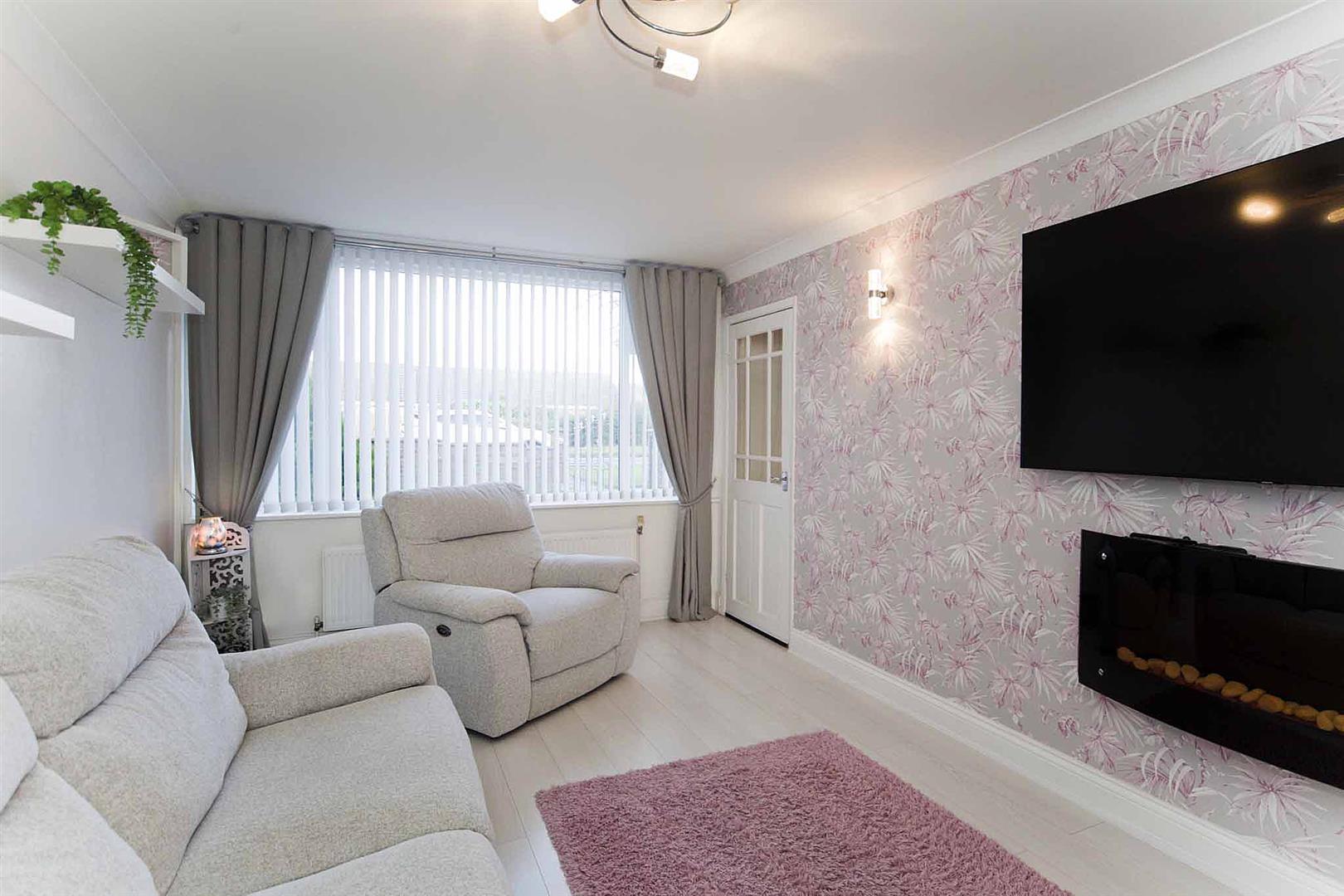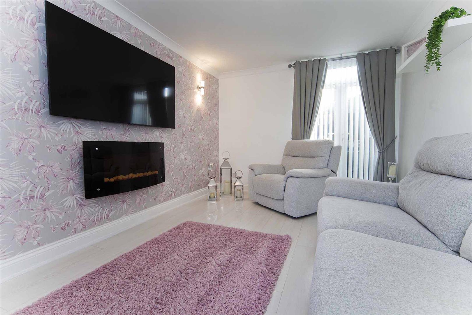 Dual aspect lounge benefiting from window to the front and French doors leading to the rear garden, wall mounted contemporary electric fire, decorative coving, pretty decor, laminate flooring.