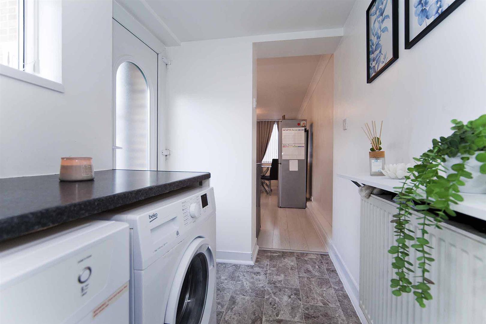 Useful utility room with plumbing for washing machine and space for tumble dryer, ample space to perform laundry duties with half glazed rear access door, pristine decor.
