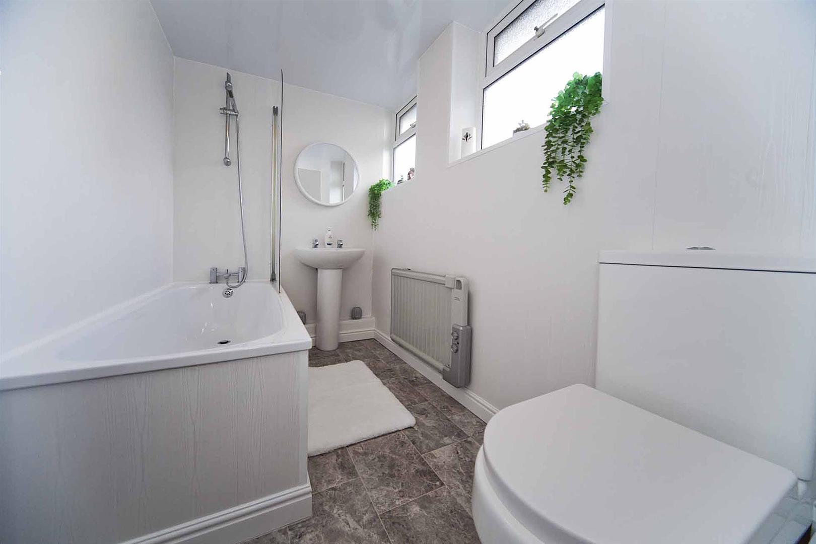 Modern family bathroom newly installed comprising bath, over bath shower, glass shower screen, close coupled WC and pedestal wash basin with modern panelling, twin windows.