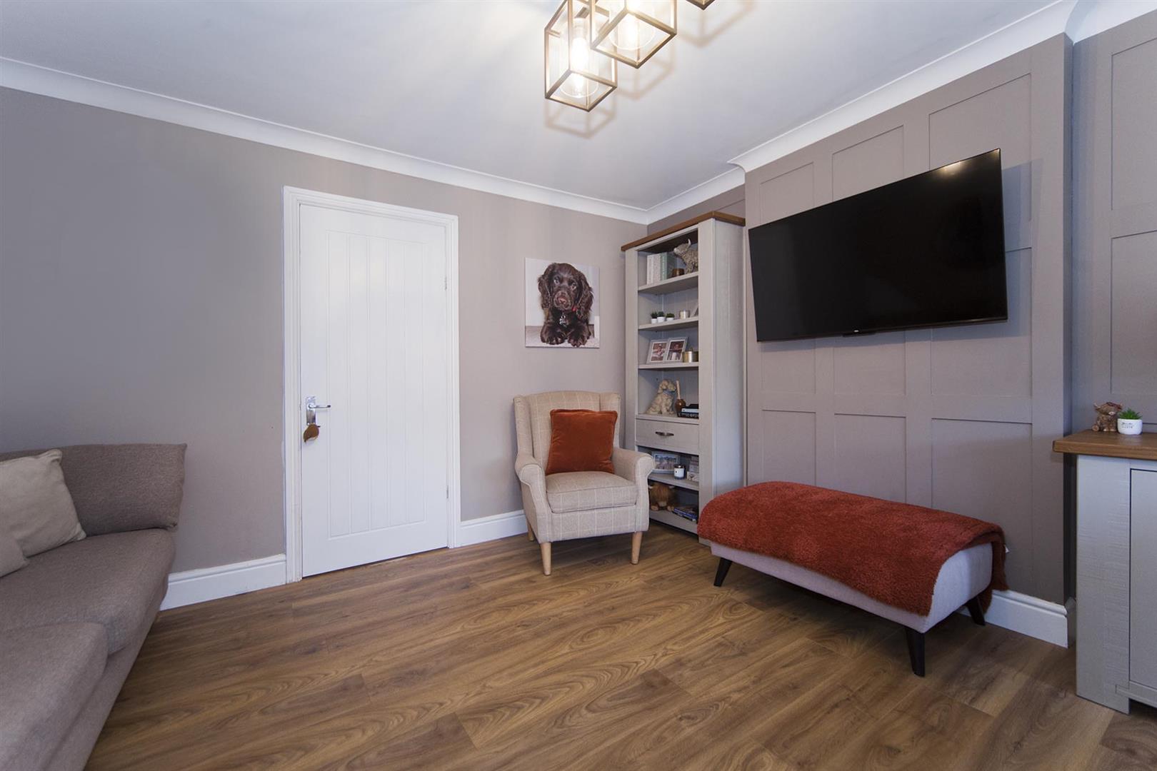 Superb lounge benefiting from bow window to the front elevation, fitted storage cupboard, custom wall panelling, decorative coving, exceptional decor, laminate flooring.